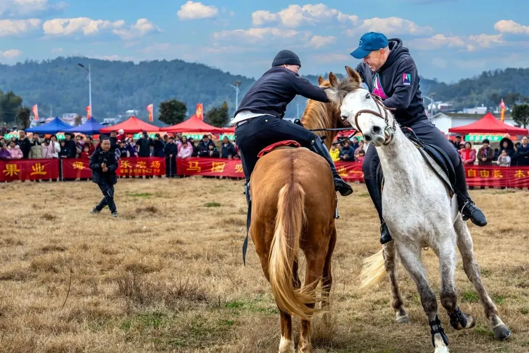1. 瞬间张力拉满:两位骑手近距离互动,白马侧头、棕马稳立,肢体接触的瞬间充满对抗感与趣味性,让静态画面自带“马上较量”的动态故事,极具视觉冲击力。
