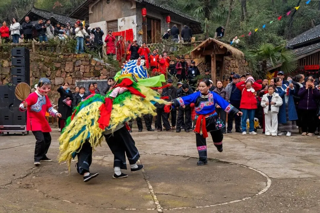 2. 构图层次饱满:前景表演者动作舒展、色彩浓烈,是绝对视觉核心;中景围观群众层层环绕,有人举着手机记录、有人驻足欢笑,生动还原了“全民围观”的热闹氛围;背景的石墙老屋、红灯笼与山林,清晰交代了“南科院子”的乡土语境,让画面有了扎实的地域文化根脉。