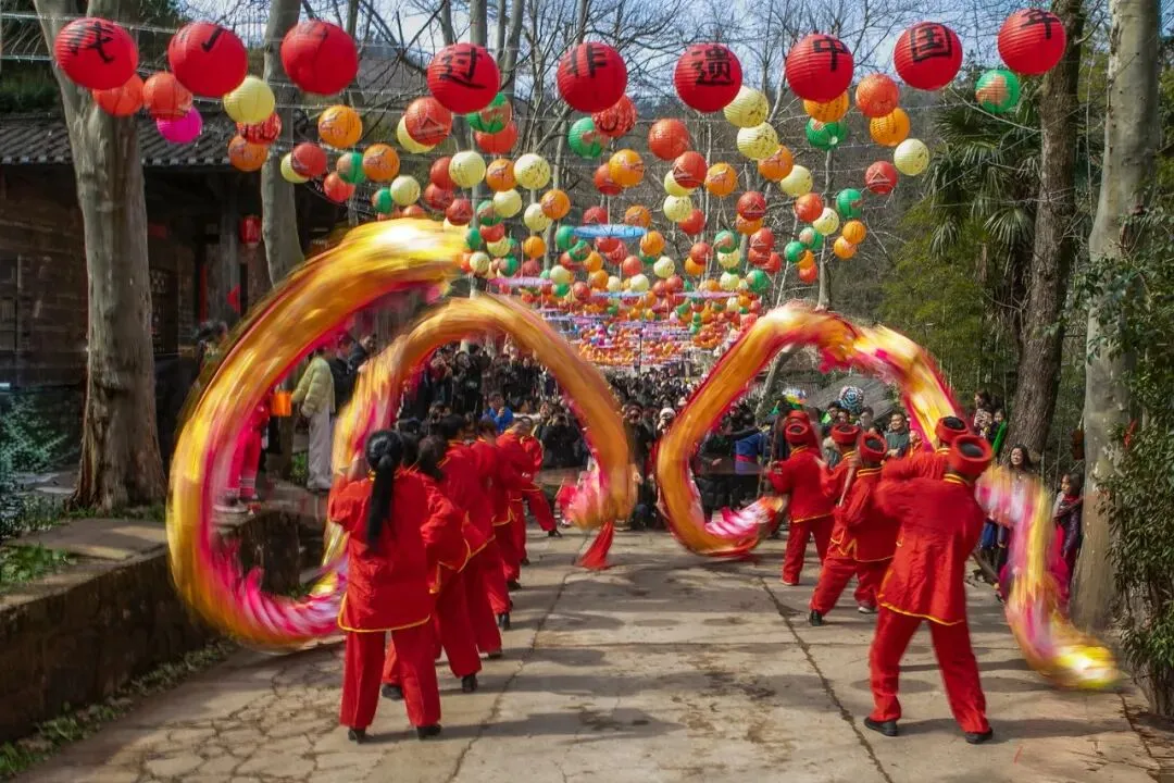 2. 构图层次饱满有序:前景的舞龙队伍占据视觉核心,中景的围观人群层层簇拥,背景的古巷、灯笼与山林层层递进,完整呈现了“非遗闹春”的热闹场景,叙事感十足。