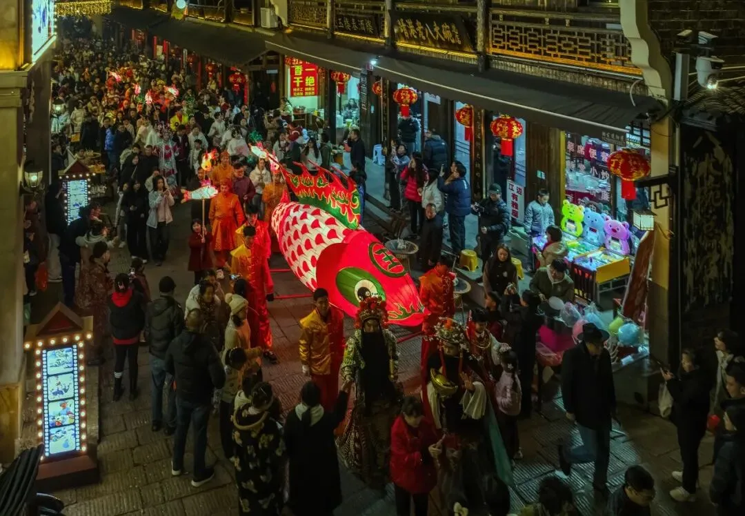 采用俯拍视角,将古街的纵深感与人群的热闹感完美呈现。青石板路向远处延伸,两侧的木质骑楼与红灯笼形成天然框架,把视觉焦点牢牢锁在中央的鱼灯与巡游队伍上,构图饱满且层次分明。