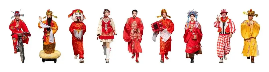 从骑单车的喜庆官服、传统财神、卡通财神,到汉服少女、中式婚服、西洋小丑,角色涵盖了传统民俗、国潮与西式趣味,既体现了华谊电影小镇的文旅特色,又展现了新春“中西合璧、喜乐共融”的多元年味。