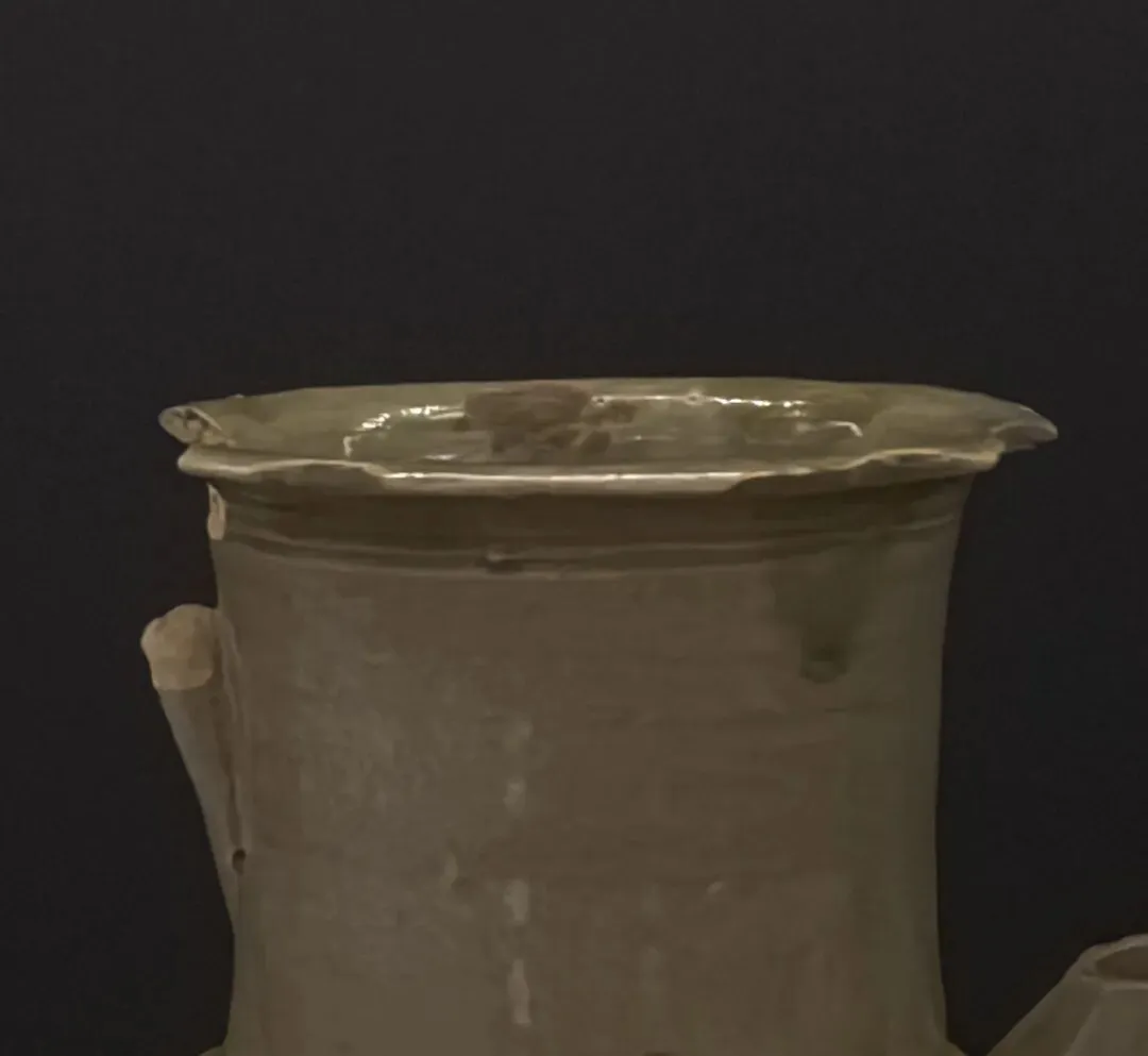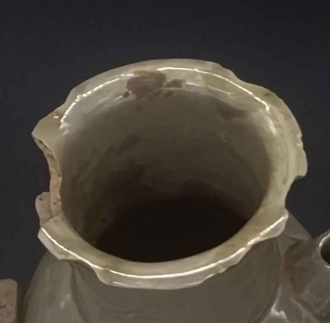 器物之妙,往往藏于细节。这件执壶最见匠心之处,在于口沿与颈部的巧思处理。壶口虽有残损,却并未草草了事,匠人刻意雕琢为葵口形制,线条婉转柔和,与瓶身瓜棱凹痕遥相呼应,气韵贯通。口沿下方再刻两道简约弦纹,不多一分繁复,不减一分清雅,瞬间让整器灵动起来,于朴素之中见精巧,实属难得一见的巧思安排。