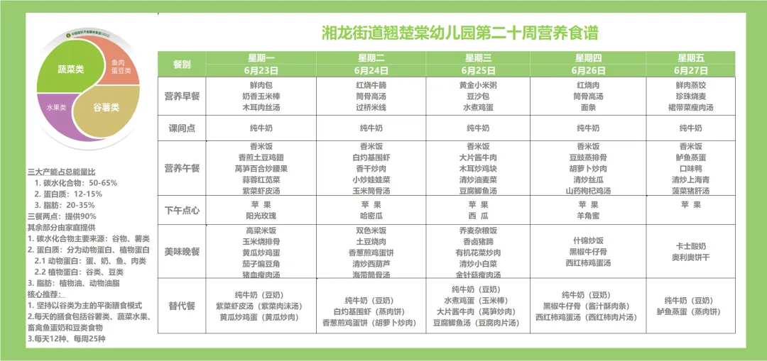 翘楚棠幼儿园根据幼儿体格生长发育特点及中国学龄前儿童膳食指南制订食谱。每日膳食提供的食品包括五大类:粮食类、蔬菜水果类、鱼肉禽蛋类、豆制品奶制品类、油脂类等,且依据科学的幼儿食物摄入量及比例制定带量食谱,以保证食物摄取的种类平均每天12种或是每周达到25种以上。每一个环节都强调安全与卫生,从供货商的选择、原料与食材的采购、食品的验收、食品的保存、食品的留样、餐具的使用、厨房器械的选择等每一个环节都对安全与卫生严格把关,以保证孩子吃到的每一样食品都是放心食品。