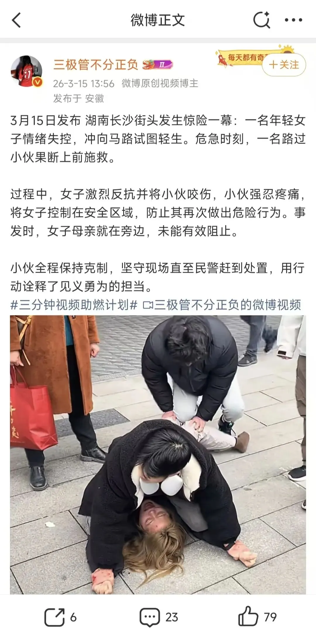 长沙一年轻女子情绪失控试图轻生,小伙施救反被女子咬伤