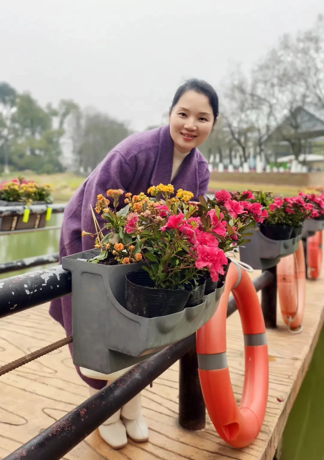门口有个用花朵编制成的大“福”字,迎面是很开阔的湖面,湖边立着大片红杉林。虽然树林还未返绿,但透过那挺拔的枝干,可以想象这儿秋冬时的美艳。