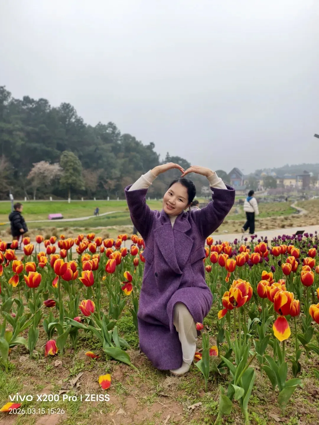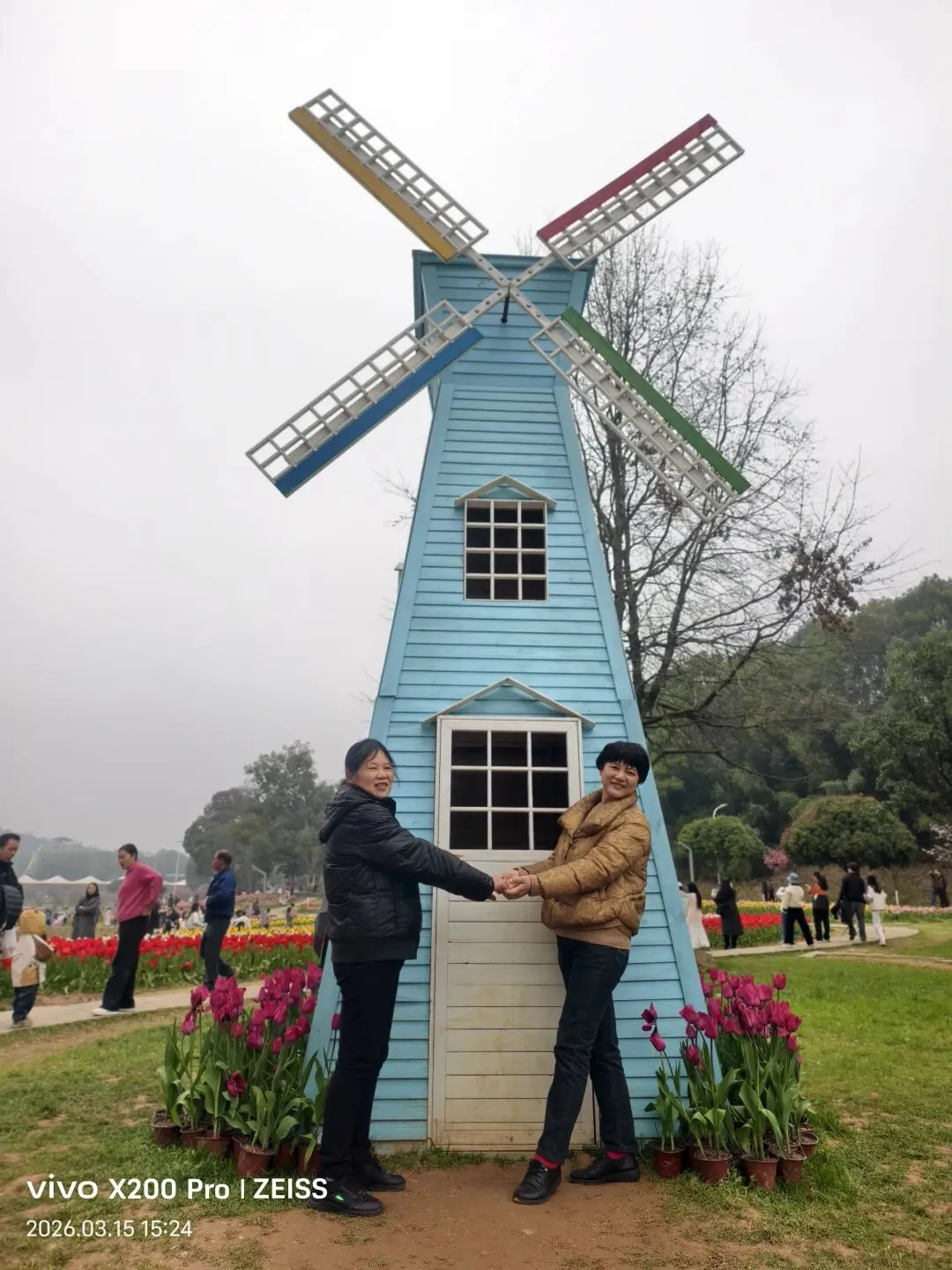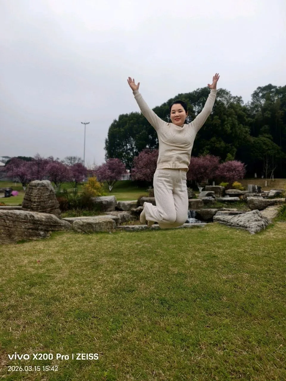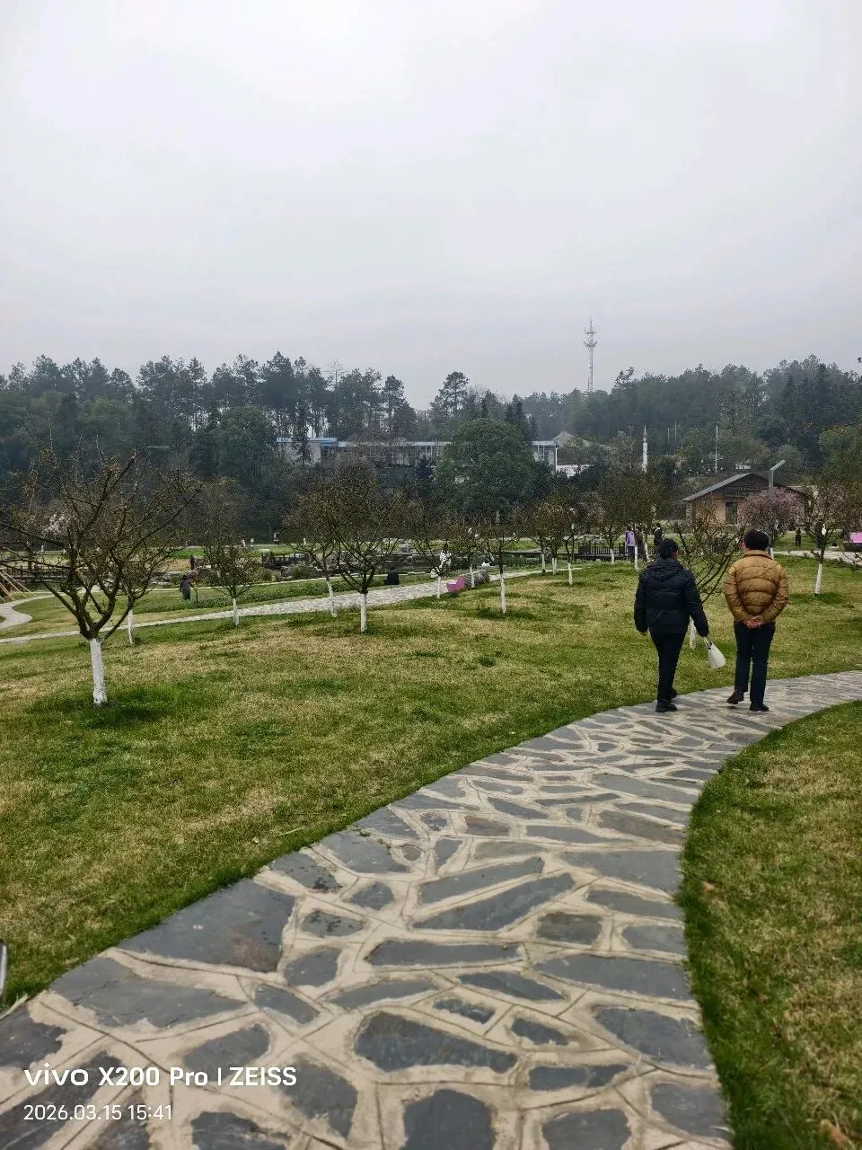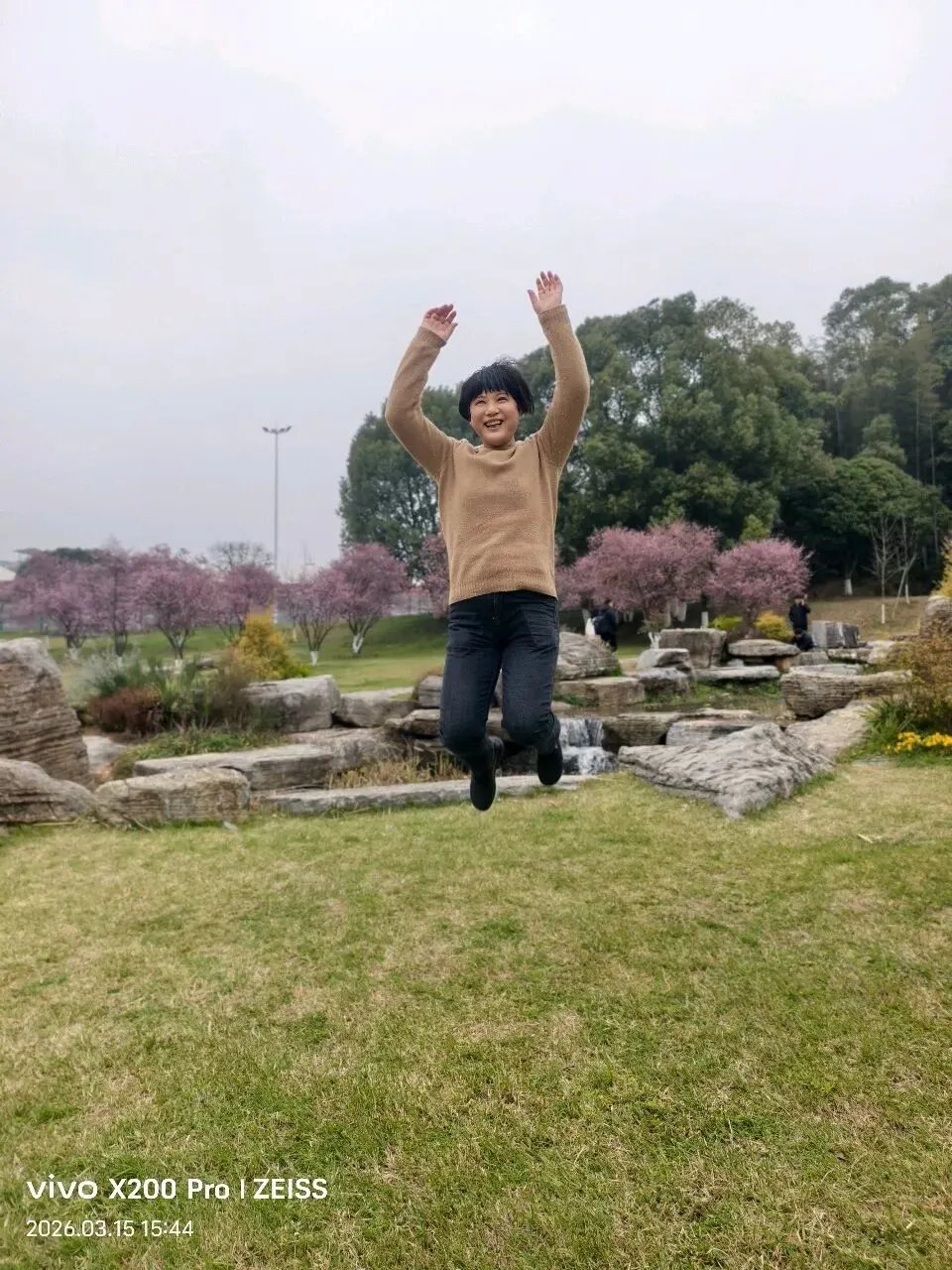 周六和周日上午的游客肯定更多,因为到处可以看到被踩倒的花枝,几乎每块花田里都有游客进入拍照的痕迹。好吧,我们也捡起地上刚被摘下或拔出的花来拍照,也钻进花田被踩硬的地盘,出片的效果确实更好。花园尽头是一片宽敞而宁静的坡地,这儿游客不多,景色很美。有绿色的草地,有潺潺的小溪,有一大片一大片开满粉红小花的李树林,还有一片未开花的樱花树林……你完全可以想象不久后,这儿樱花绽放、李子飘香、游人如织的盛况……