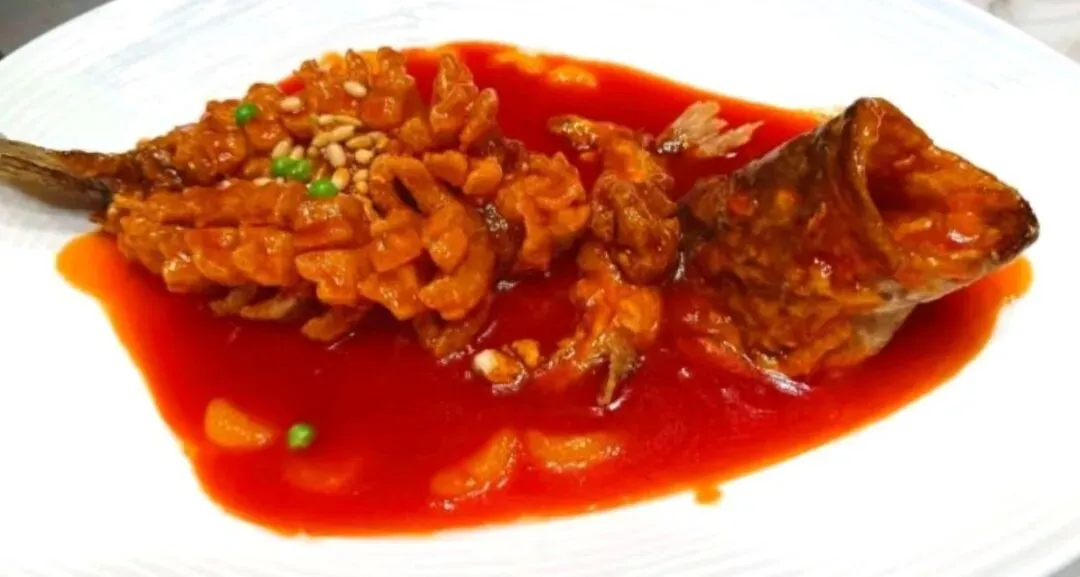 松鼠桂鱼:淮扬功夫菜,酸甜汁调得恰到好处,挂汁均匀,一看就是老师傅的手艺。小建议,花刀可以再精细点,避免鱼皮破损。炸制时油温再高点或者时间再长点,外酥里嫩的口感会更惊艳。