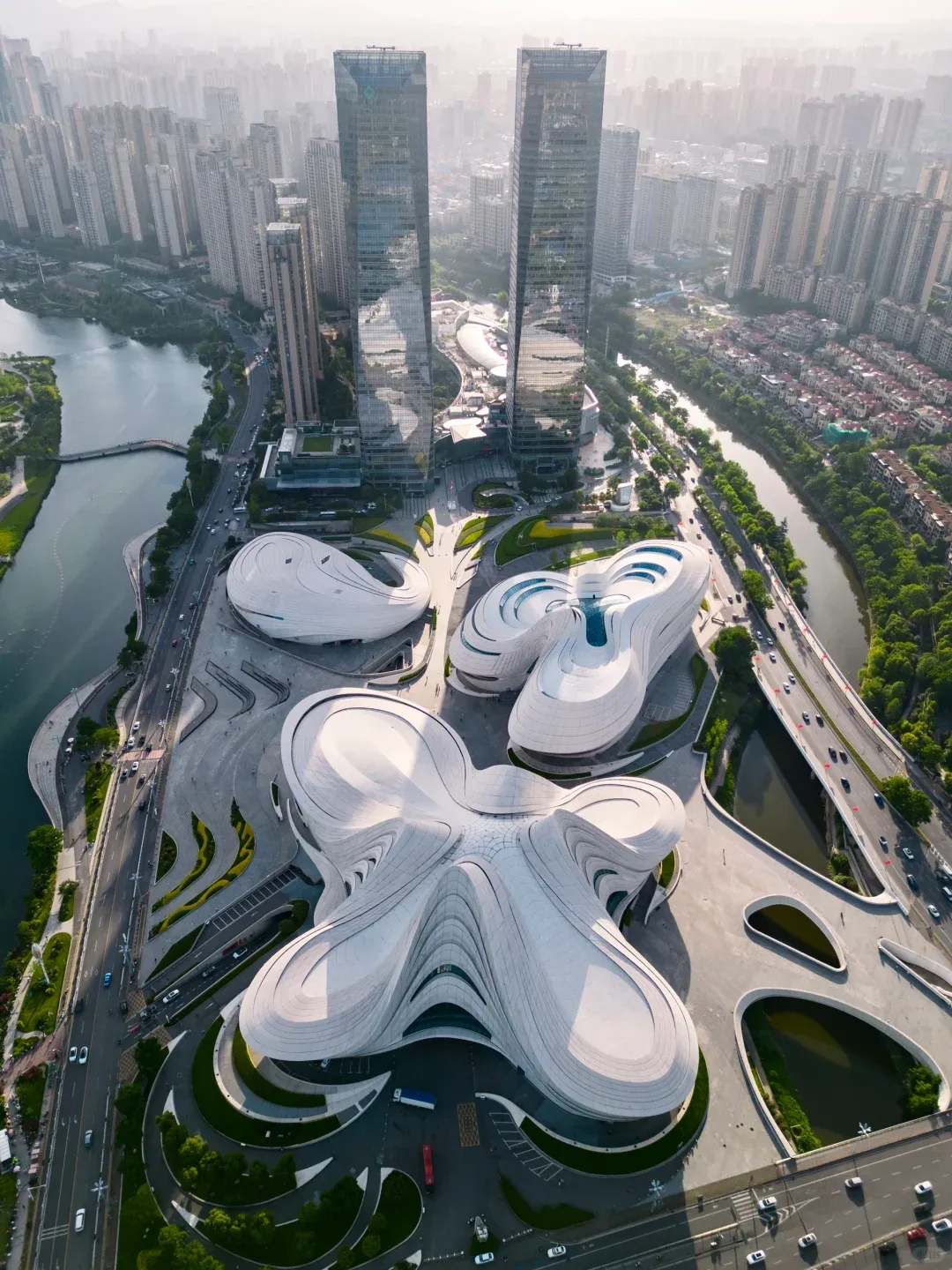 梅溪湖国际文化艺术中心的建筑外形像一朵绽放的芙蓉花,充满未来感。