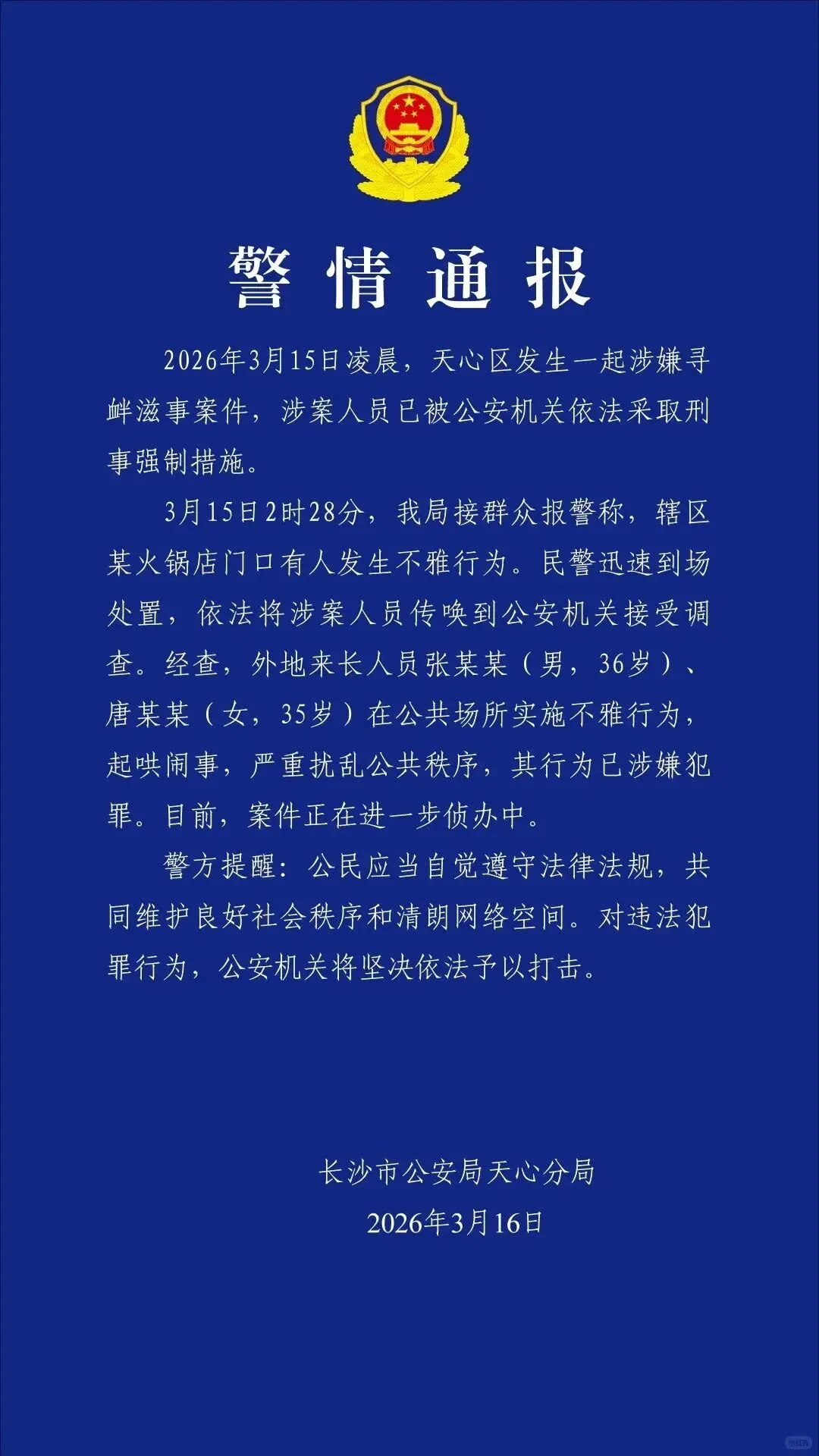 所幸,坡子街派出所的民警仅用五分钟便抵达现场,果断制止了这场闹剧,并将涉事人员迅速控制。3月16日,长沙天心公安发布警情通报,明确指出两人的行为已涉嫌寻衅滋事,依法采取刑事强制措施。