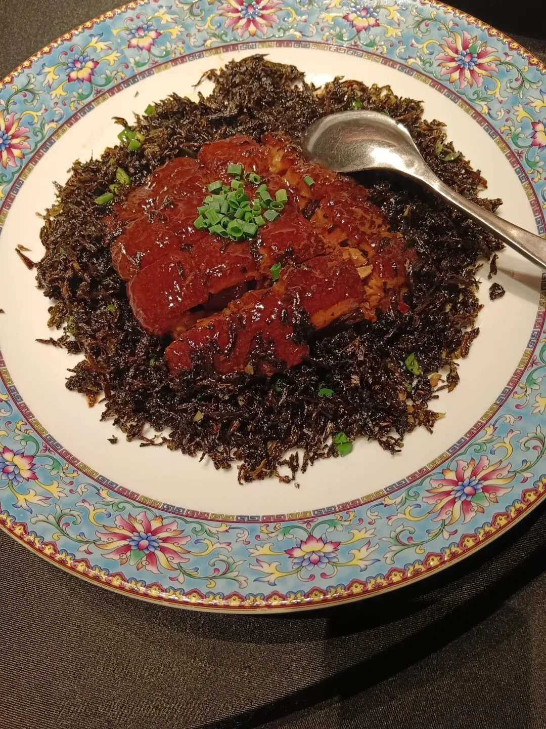 虽然是道大荤菜,不过还是清爽的,盐菜炒的很干,脆脆的,本身盐菜没太重口味,主打干,脆。肉是软软的,除去细腻的肥肉,下面的肉是一丝丝的,比较嫩,但是没什么鲜味,还可以。