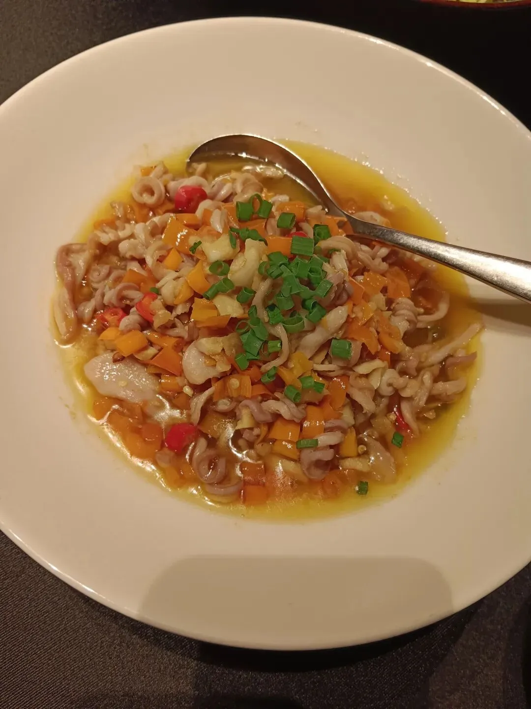 老面馒头 猪肚炒的嘎嘣脆,切的很小一条,方便入口,同为口味菜,更喜欢前面的黄贡椒牛腱。整体感受:餐厅景色无敌了,窗外夜景绝对值得一来,整体环境的美学设计也很舒服,菜品口味属于清淡,如果追求口味不适合,可能也符合它的定位,适合商务宴请,如果约会或者请朋友吃饭,是很客气的选择,因为夜景太美了,应该还会光顾。