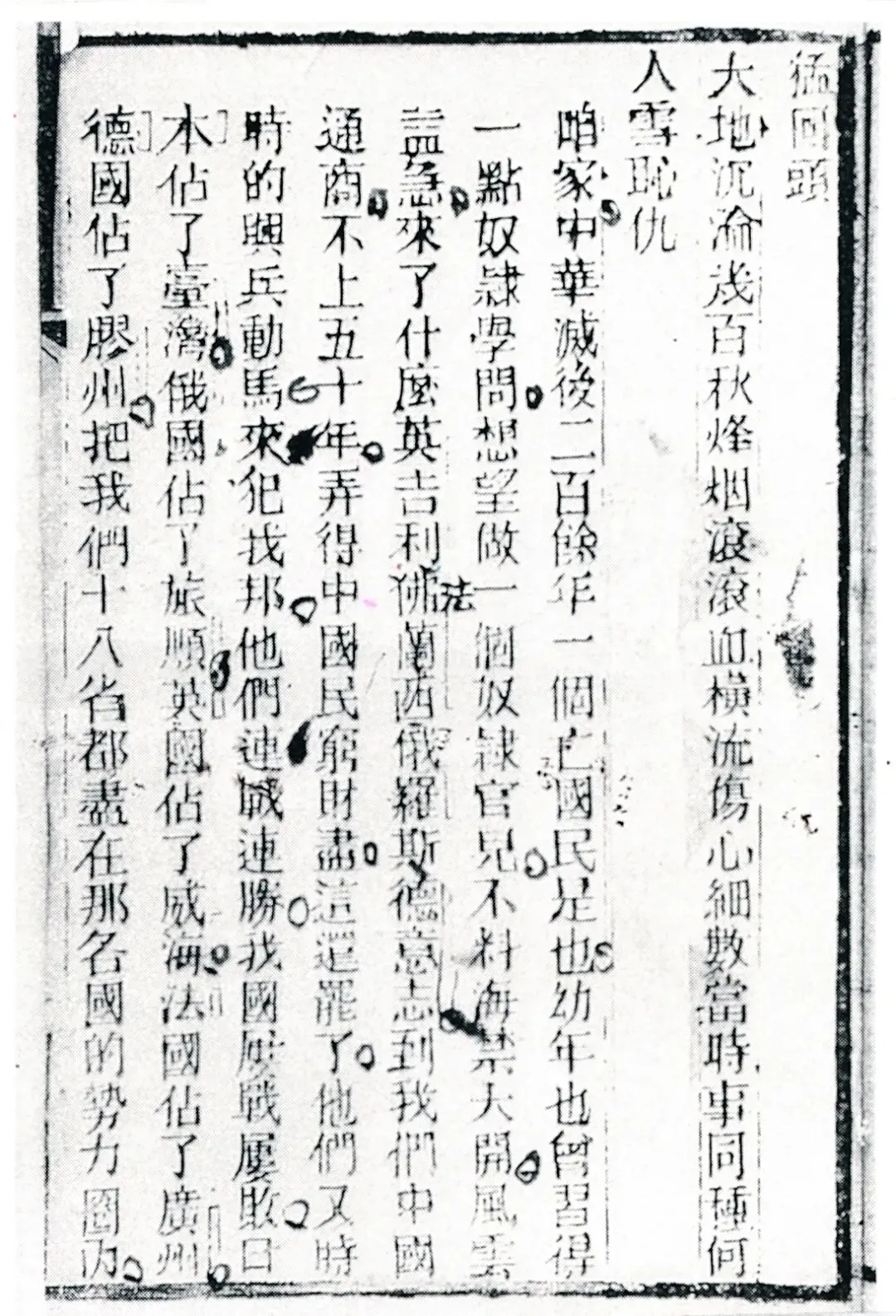 这是典型的长沙弹词,它用极为通俗、生动的唱词痛陈列强加紧瓜分中国的危急形势,激发民众的爱国热情。据杨源浚《陈君天华行状》记载,湘赣之间,三户之市,“虽目不识丁者,闻之皆泣下”,“稍识字者,即朗读《猛回头》”。至有小学之“少年,募资广刷,其感化力之深类是”。