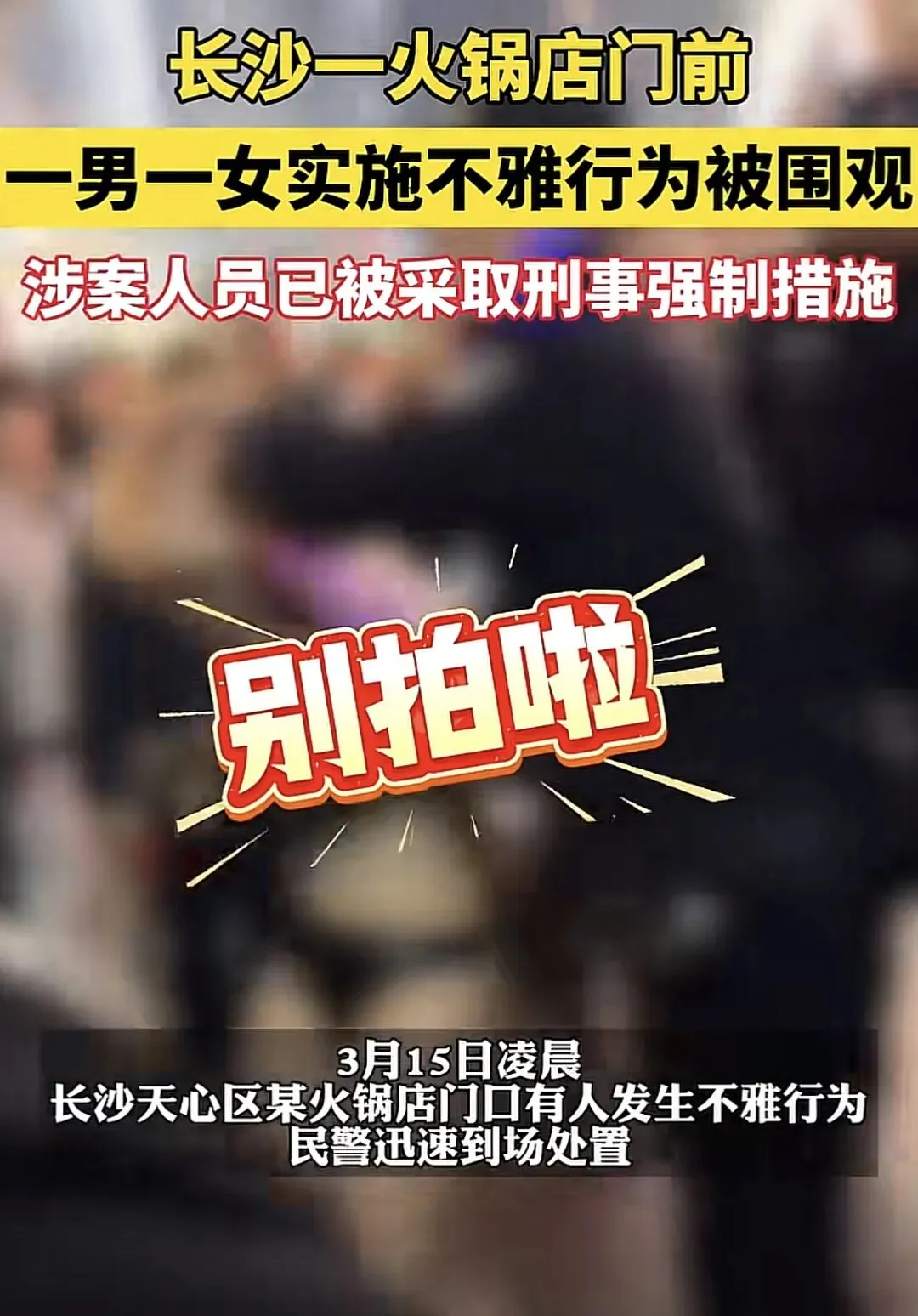 火锅店门口顿时乱成了一锅粥,谁也没有想到,法治社会竟然还有如此不知羞耻的人,把路人都当成了瞎子!不但继续恬不知耻地进行不雅行为,而且仿佛是故意闹事让大家看。有一段视频中,有人大声制止拍摄视频的群众:“别拍啦!”视频中模糊可见,女子身上只穿着黑色内衣,浅色长发。