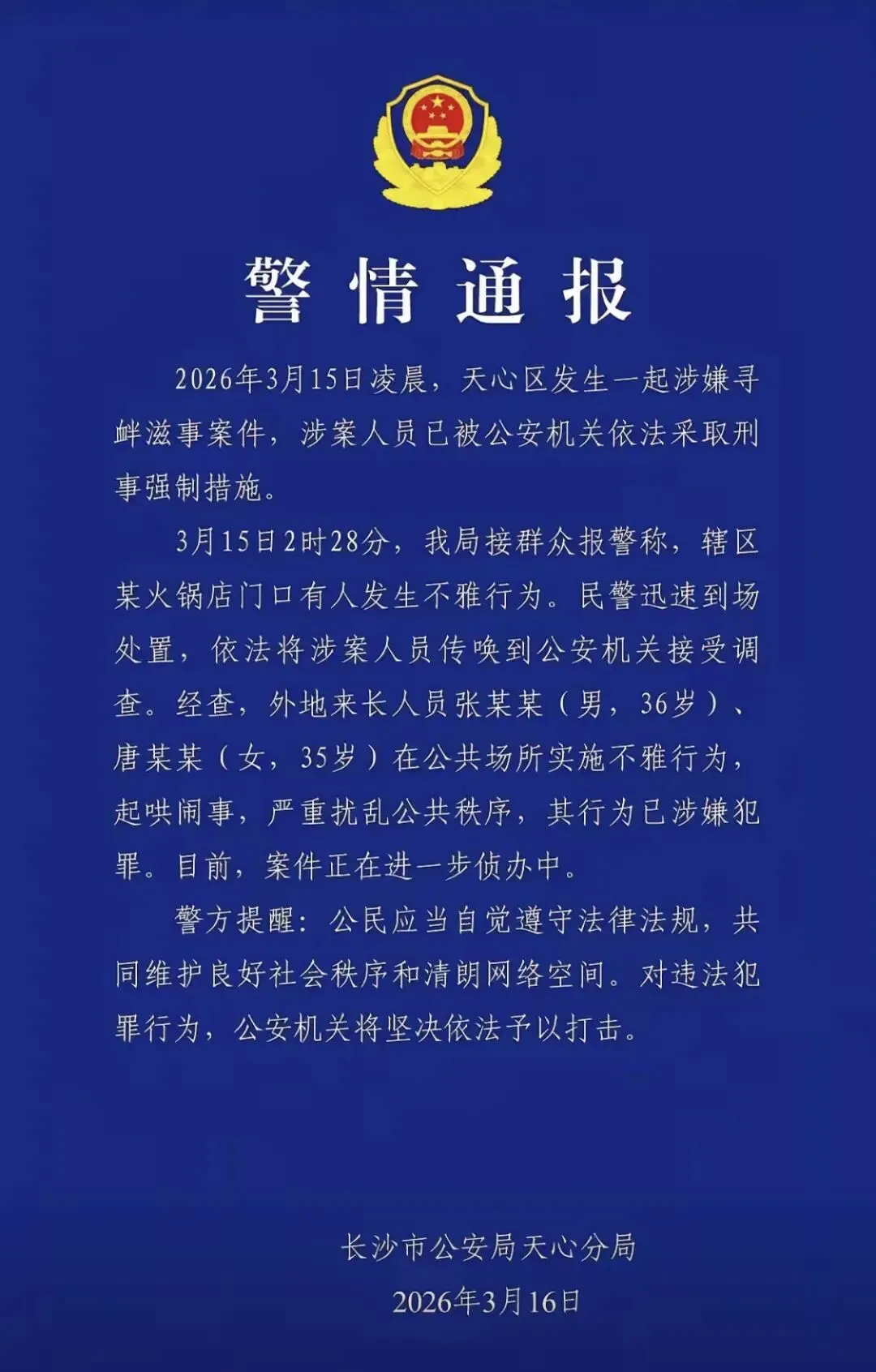 2026年3月15日凌晨,天心区发生一起涉嫌寻衅滋事案件,涉案人员已被公安机关依法采取刑事强制措施。