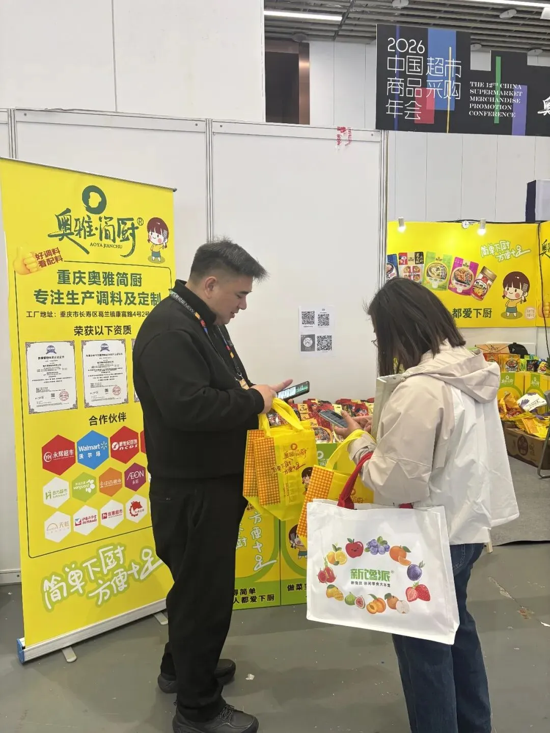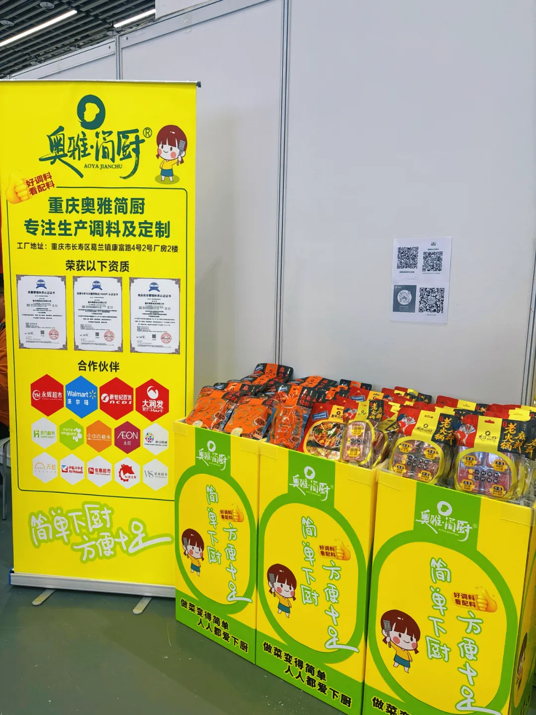 “做菜变得简单·人人都爱下厨”的标语,就是我们最真诚的品牌承诺。展位上,我们清晰展示了公司实力:从重庆长寿区的生产基地,到所获得的各项认证资质,以及永辉、沃尔玛、新世纪、大润发等全国零售系统的合作伙伴,这一切都让前来咨询的客户倍感安心。