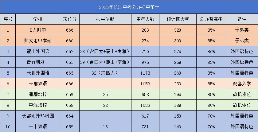 从2025年中考情况来看,长沙首次参加中考的公办初中里,前三名都是长郡双语系学校——长郡双语白石湖、长郡双语谷山、长郡双语雨花。
