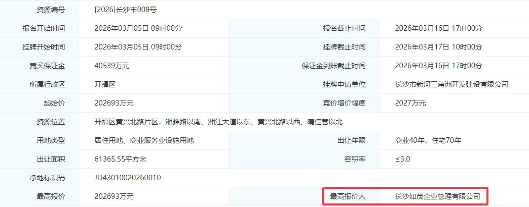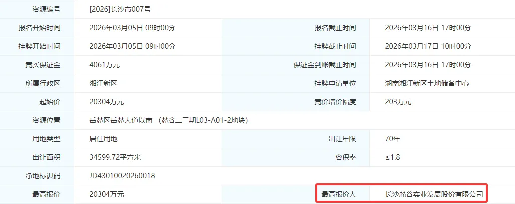 被长沙麓谷实业发展股份有限公司(麓谷实业)底价摘得,成交总价20304万元,折合楼面价3260元/㎡。