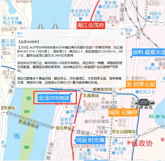地块地理位置堪称绝版:地处河东市中心,西侧一线临江,对望岳麓山、橘子洲头,江景视野开阔;紧邻地铁1号线和6号线交汇的文昌阁站,交通便利;周边配套成熟,五一商圈、湘雅医院、明德华兴中学等优质资源环伺。
