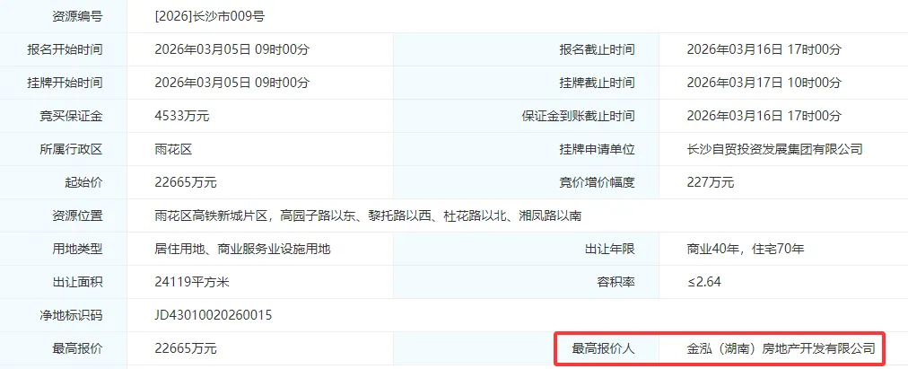 被本土房企金泓(湖南)房地产开发有限公司(金泓)收入囊中,成交总价22665万元,折合楼面价3560元/㎡。