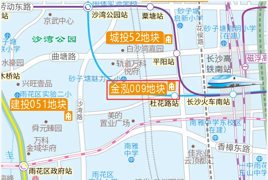 地块位置同样优越,是地铁2号线杜花路站上盖项目,交通便利;周边砂子塘启新小学、长郡双语雨花中学等教育资源丰富;吾悦广场、山姆会员店等商业配套完善;沙湾公园、浏阳河风光带等生态资源环绕。