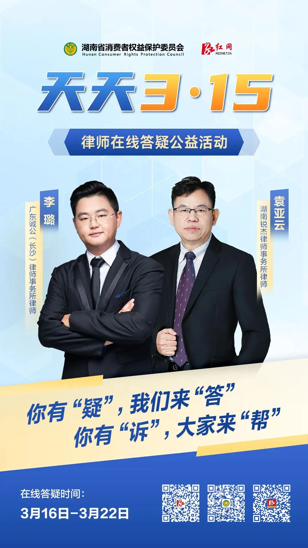 维权无忧,天天在线!湖南省消保委携手红网开展“天天3·15 律师在线答疑”公益活动,32名专业律师轮值在线,365天响应消费者诉求,让您的合法权益天天有保障!本期由湖南省消保委第三届律师团袁亚云律师(湖南锐杰律师事务所)提供专业法律解答。
