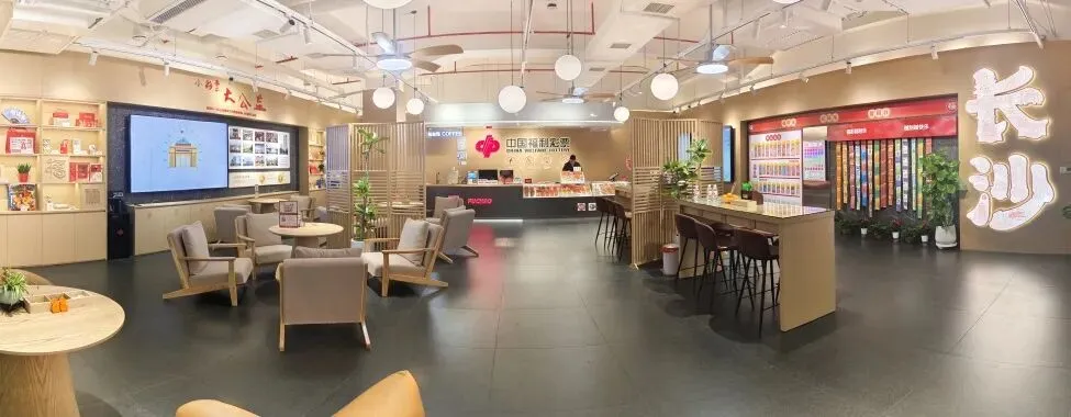 作为长沙福彩重点打造的标准化形象示范店,该福潮店从设计到运营,均严格遵循“标准化”理念,确保服务与品质的高标准。店内整体以莫兰迪暖色系为基底,搭配浅木色格栅与原木色台面,配上柔和的漫射灯光,营造出温馨雅致、松弛舒适的氛围。店内鲜花绿植点缀其间,将福彩文化、长沙地域特色与现代休闲理念深度融合,充分展现标准化带来的高品质感。