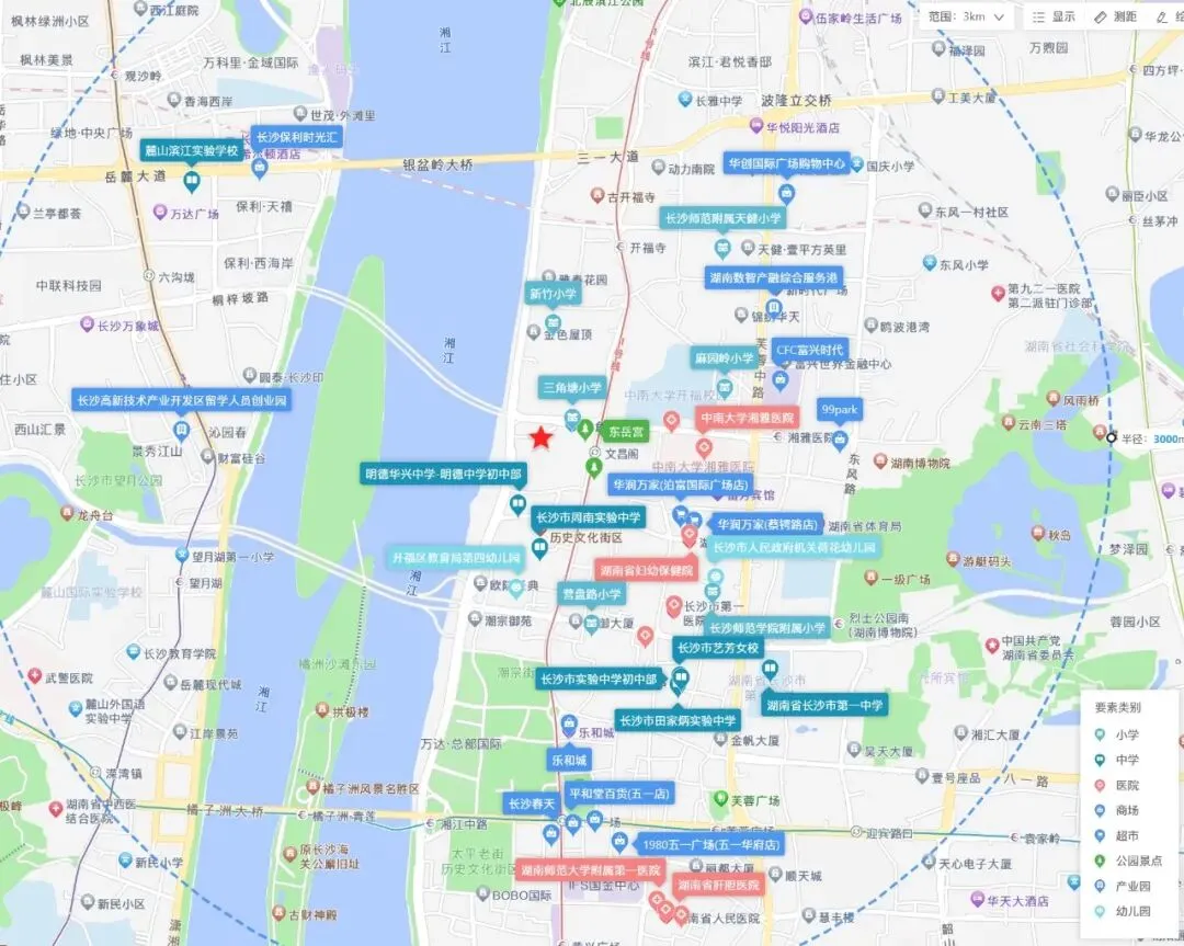 该地块所处开福中心板块处于发展阶段,现状投资价值较高。位置交通便利,邻近地铁1号线、6号线,多条公交线路环绕,且距离文昌阁地铁站仅0.3km。周边生活氛围浓厚,教育、商业、医疗配套完善,地块3km范围内聚集了长沙师范附属天健小学、湖南省长沙市第一中学、三甲医院中南大学湘雅医院皮肤病医院、购物中心CFC富兴时代等生活配套。