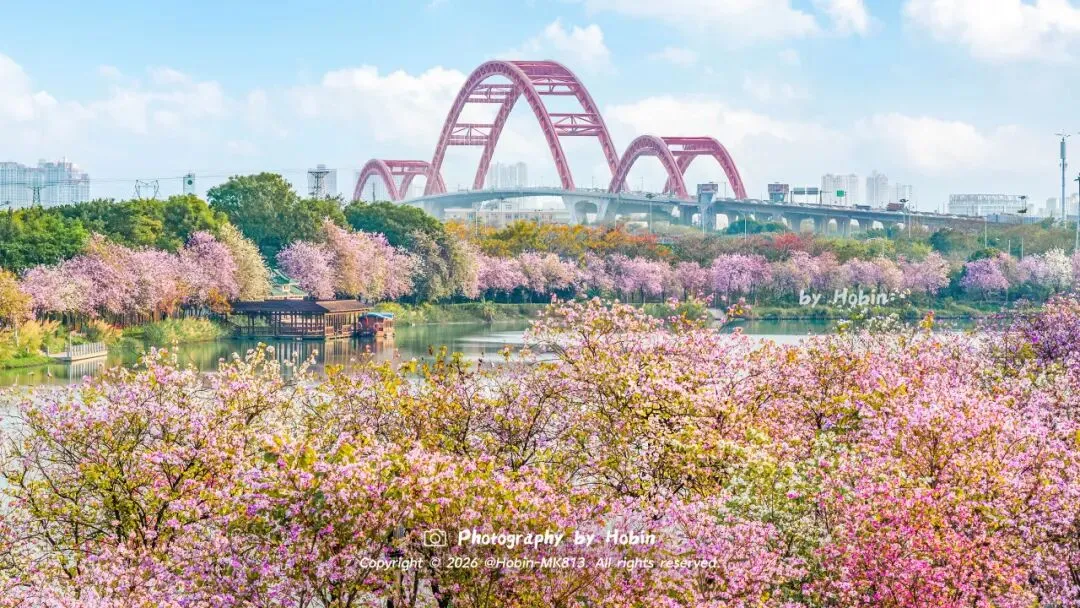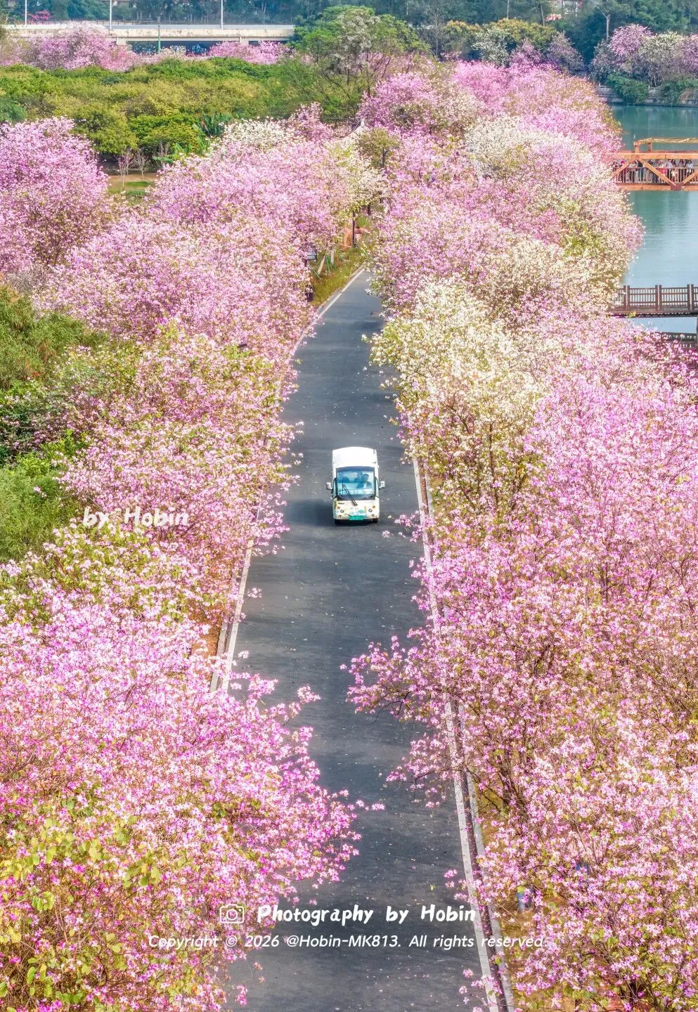 海珠湿地被宫粉紫荆染成粉色的海洋