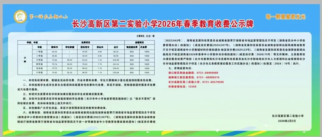 六、收费依据:湖南省发展和改革委员会湖南省新闻出版局湖南省教育厅湖南省市场监督管理局关于印发(湖南省中小学教材价格管理办法》的通知》《湘发改价费规(2022)307号)、《湖南省发展和改革娄员会湖南省财政厅湖南省教育厅湖南省市场监督管理局关于进一步明确我省中小学教育收费政策的通知》(相发改价费规〔2022)643号〕、湖南省发展和改革委员会湖南省教育厅湖南省市场监督管理局关于印发《湖南省民办中小学收费管理办法》的通知》《湘发改价费规(2024)307号)、《湖南省发展和改革委员会湖南省新闻出版局湖南省教育厅关于核定湖南省中小学教辅材料价格的通知 相发改价费(2025)23号)、《湖南省发展和改革委员会湖南省新闻出版局关于核定湖南省2026年春季中小学教科书价格的通知》(湘发改价费〔2026)75号〕等文件精神,义务教育校内课后服务收费严格按《长沙市教育局长沙市发展和改革娄员会长沙市财政局长沙市人力资源和社会保障局长沙市市场监督管理局关于印发《长沙市义务教育课后服务工作实施办法》的通知》(长教发〔2024〕18号〕执行。