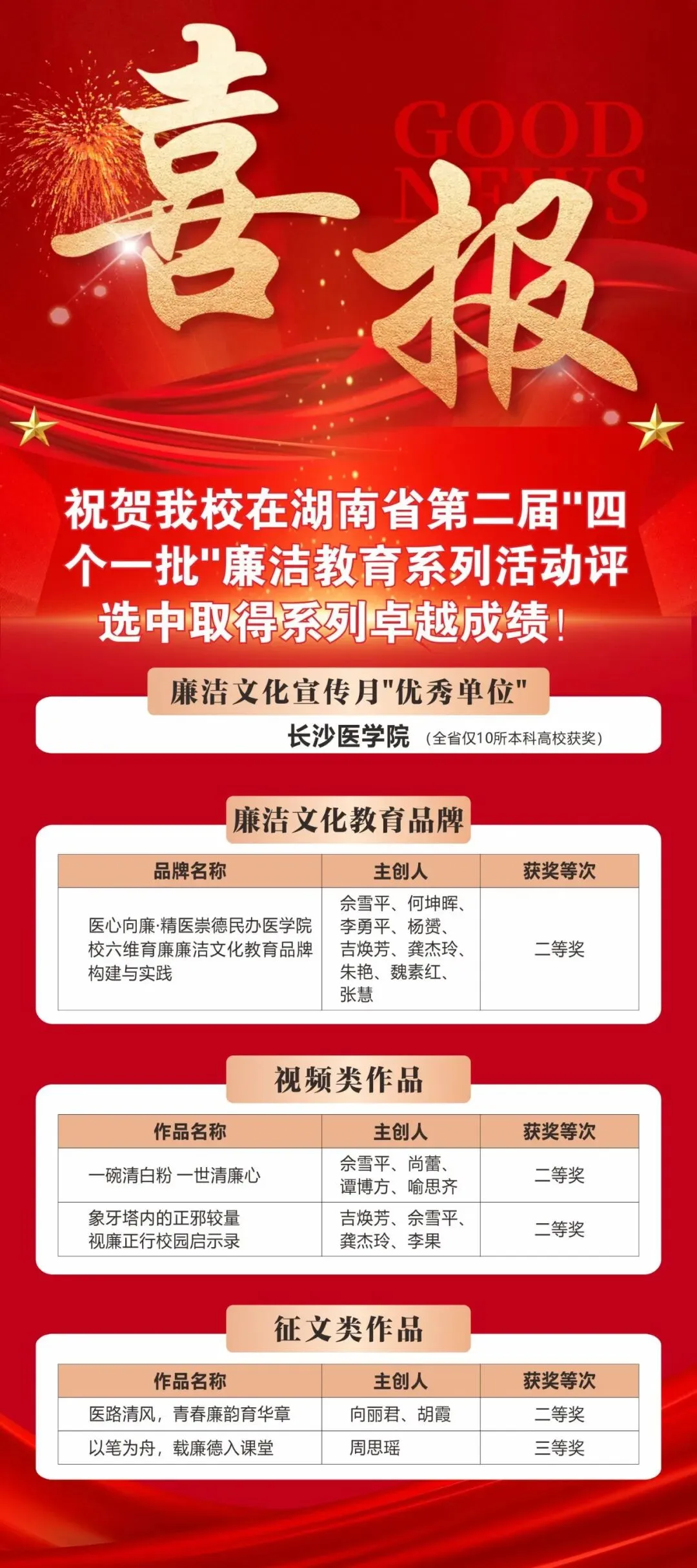 长沙医学院始终将廉洁文化建设作为全面从严治党、落实立德树人根本任务的重要抓手,以“医心向廉・精医崇德”为核心理念,系统推进廉洁文化进校园、进课堂、进师生头脑。本次获评湖南省第二届“四个一批”廉洁文化宣传月“优秀单位”,是对学校常态化开展廉洁教育、创新廉洁文化传播形式、营造风清气正育人环境的高度肯定,也为全省民办医学院校廉洁文化建设提供了可借鉴的实践样本。