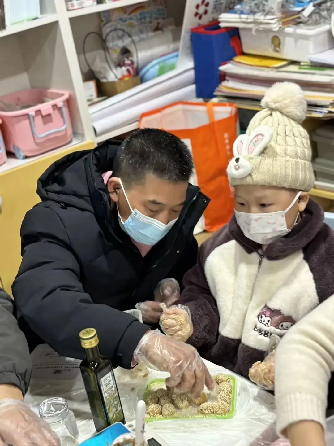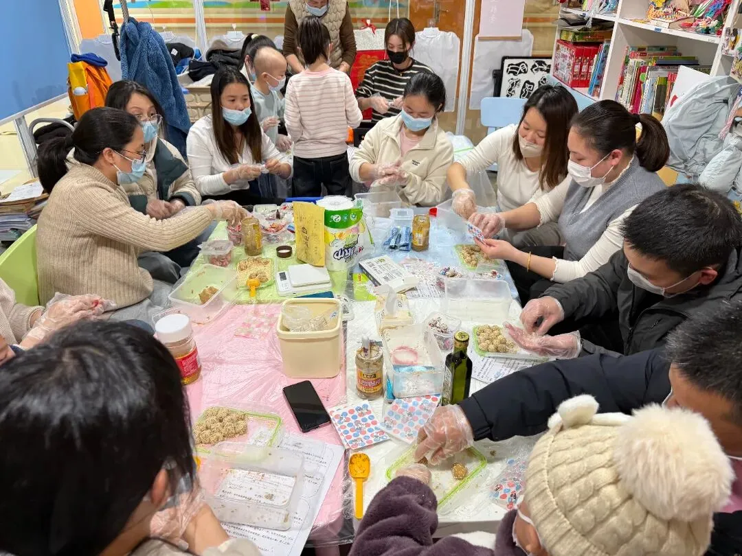 理论课程结束后,迎来了孩子们最期待的环节——营养蛋白球制作。在老师的指导下,家长和孩子们戴上手套,一起称食材、搅拌原料、搓揉成型。