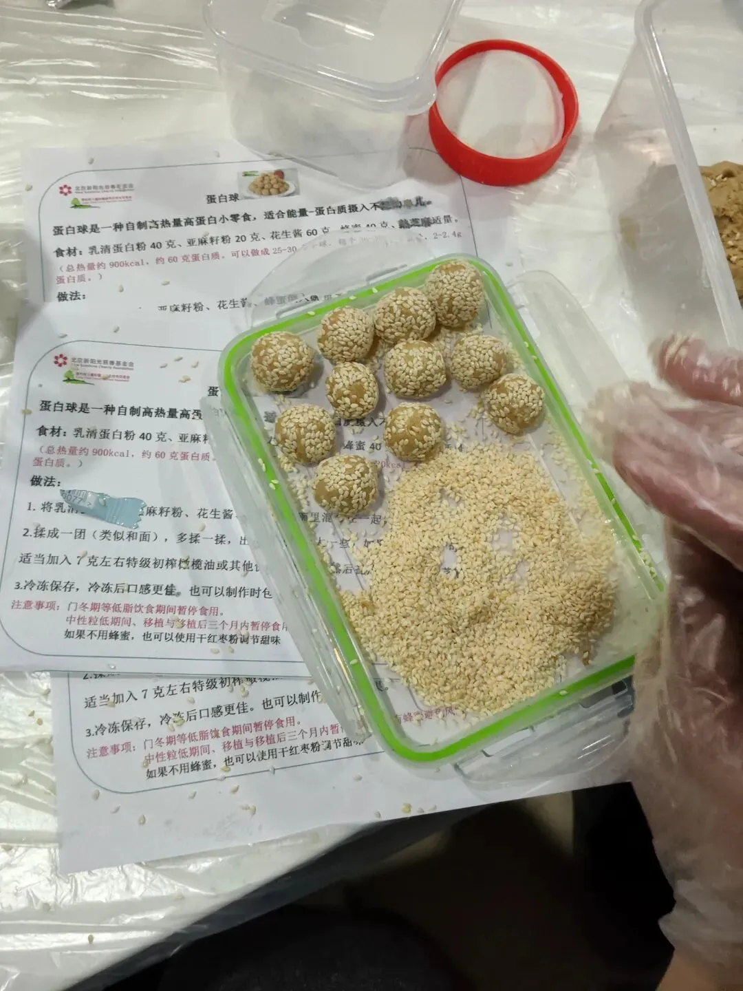 透明餐盒里,芝麻、蛋白粉、花生酱慢慢变成一颗颗圆滚滚的小蛋白球,期间满室的欢声笑语,令人雀跃。