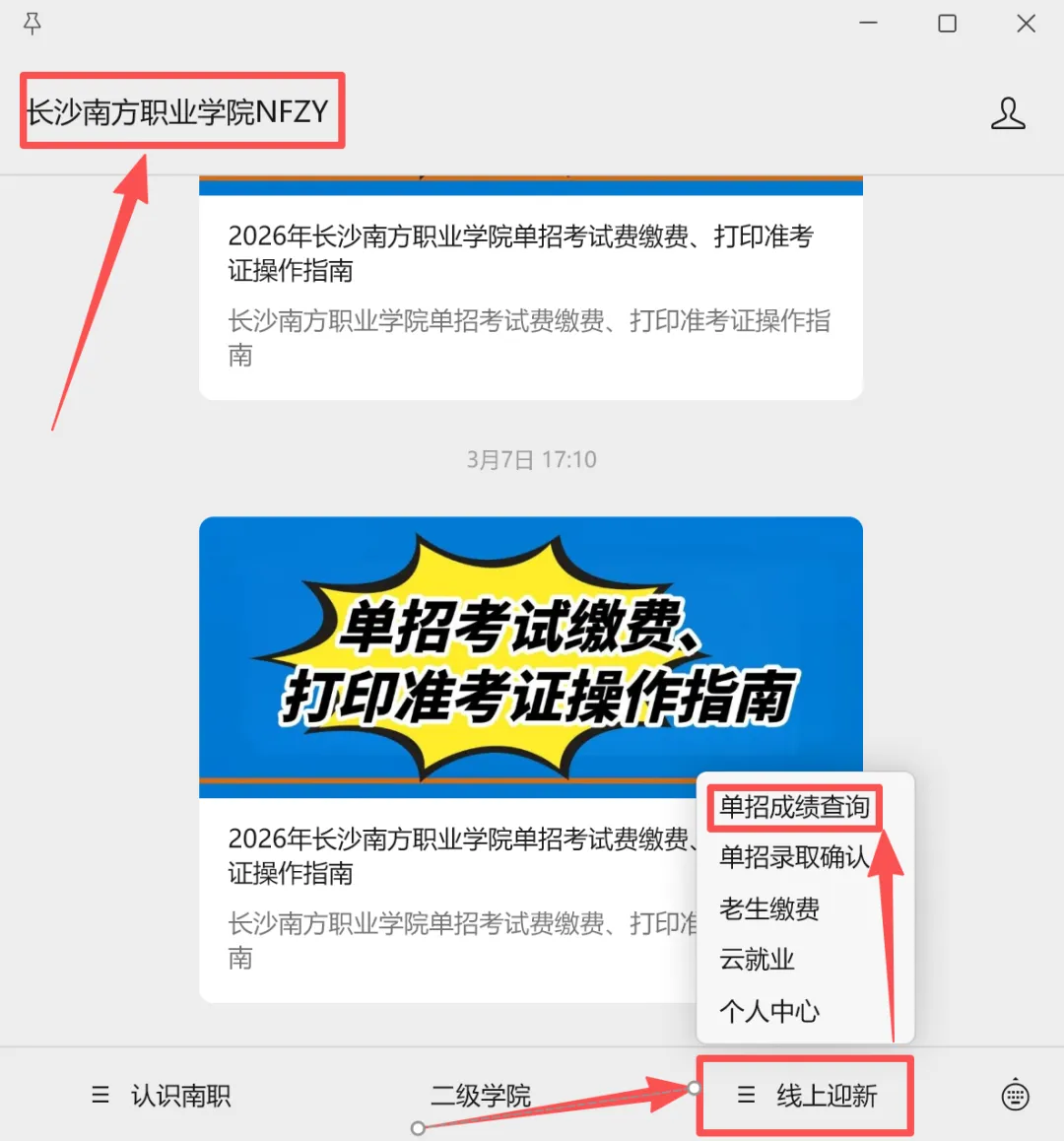 第2步:点击“线上迎新”进入“单招成绩查询”子菜单,按流程查询个人成绩。