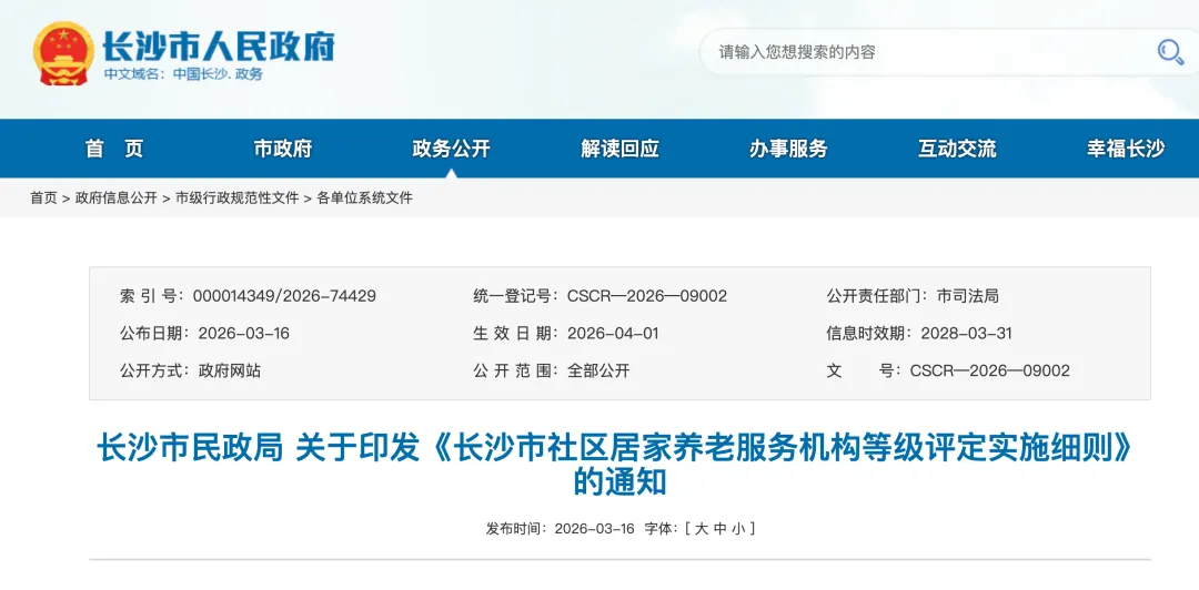 现将《长沙市社区居家养老服务机构等级评定实施细则》印发给你们,请遵照执行。本细则自2026年4月1日起施行,有效期两年。