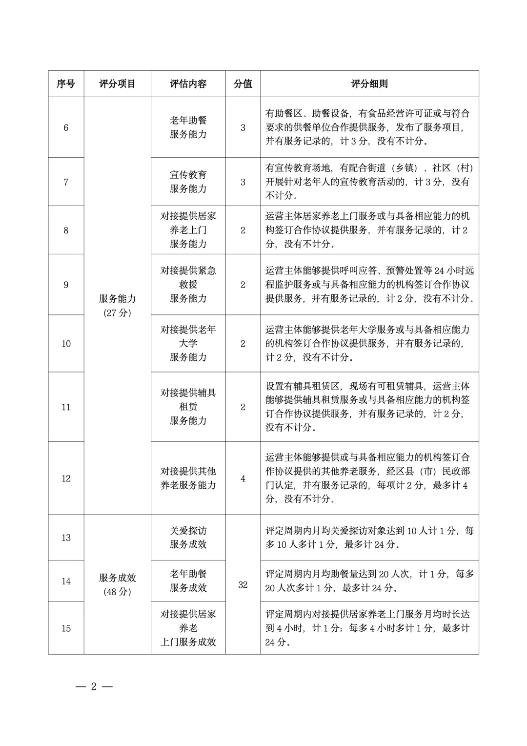 2.服务能力情况评分。由区县(市)民政部门通过市民政局明确的公开、公平、公正的信息渠道提取数据进行评分。以下两种情况可视为该社区居家养老服务机构具备该服务能力:一是社区居家养老服务机构运营方具备服务能力;二是社区居家养老服务机构运营方与具备服务能力的第三方签订合作协议提供服务。