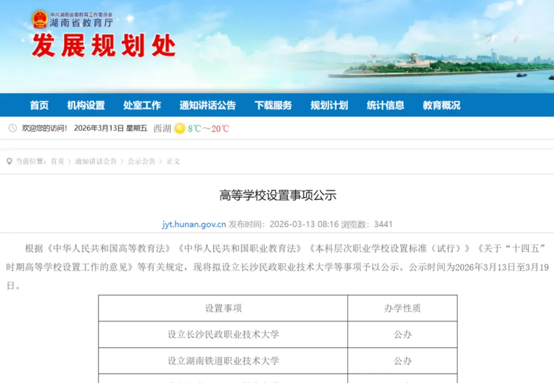 直到2026年3月13日,湖南省教育厅发布多个通告和公示,拟设立长沙民政职业技术大学、湖南铁道职业技术大学、湖南工业职业技术大学,长沙民政职业技术大学专科升为本科院校的道路才终于即将完成。