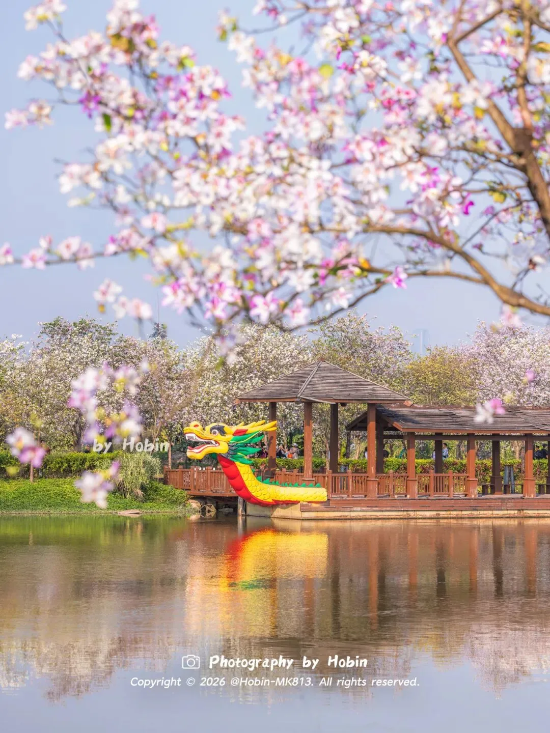 海珠湿地被宫粉紫荆染成粉色的海洋
