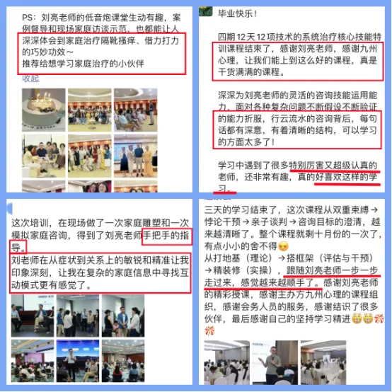 刘亮老师对于家庭治疗核心技术的学习、拆解、教授,有着自己的独到见解。一步一步帮学员夯实基础,筑牢技术,打磨细节,将家庭治疗熟练应用于临床实操。