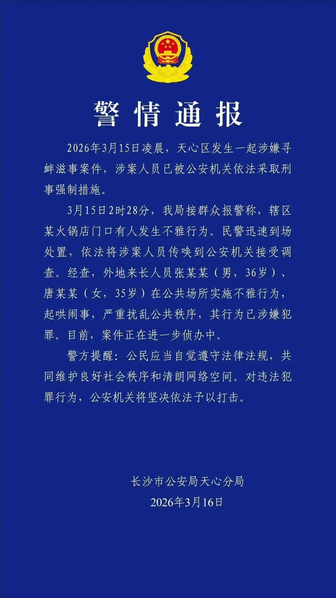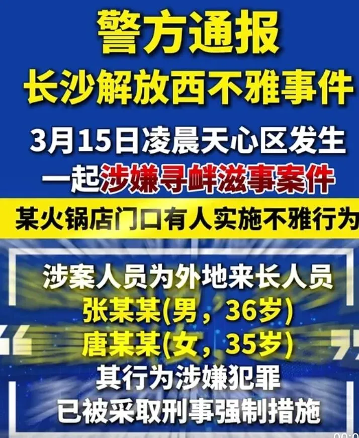 长沙警方的通报写得非常克制:外地来长人员、公共场所、不雅行为、起哄闹事、严重扰乱公共秩序、涉嫌犯罪、刑事强制措施。