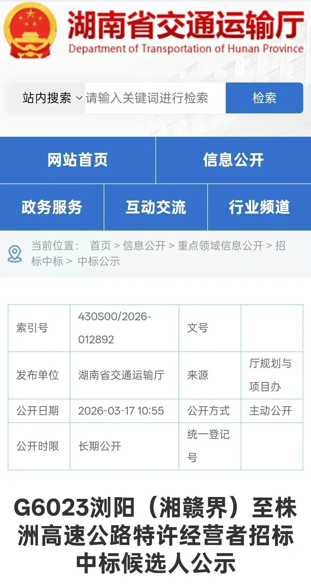 今天,湖南省交通运输厅发布了《G6023浏阳(湘赣界)至株洲高速公路特许经营者招标中标候选人公示》: