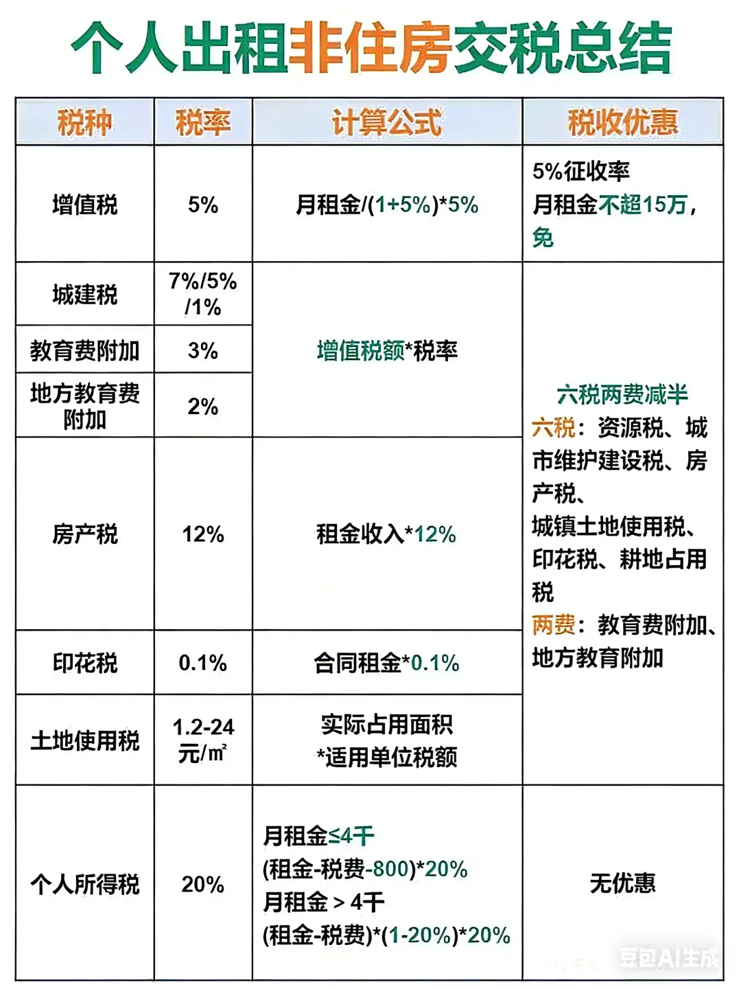 科普下个人持有写字楼出租的税费:主要为房产税6%(减半征收)+增值税5%(普票可免)+20%个税(计算方法:[房租金额-20%]*20%),还有城建附加费用,综合下来,即使开具房屋租赁普通发票,也要23%左右。