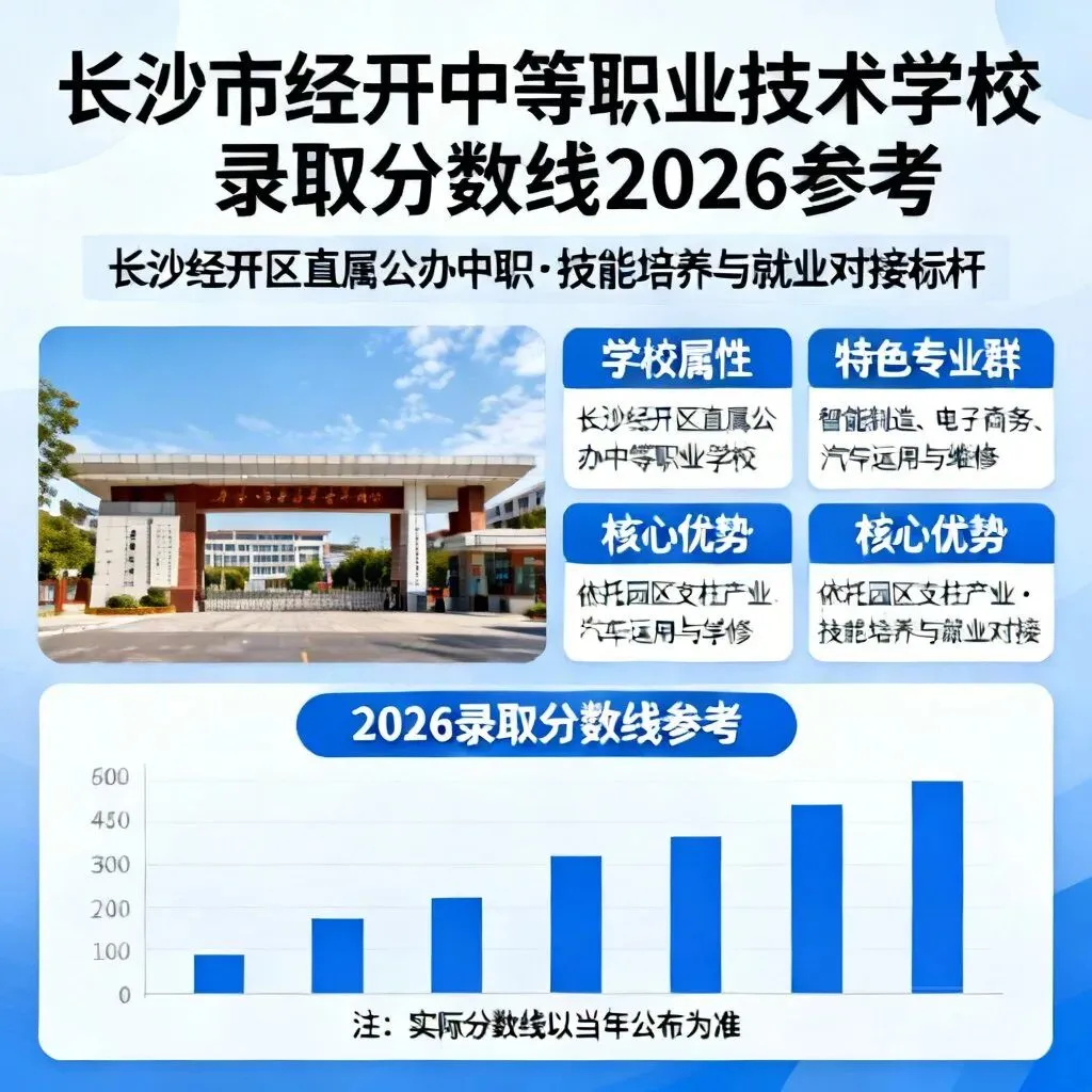 结合过往趋势与变量分析,2026年长沙市经开中等职业技术学校的录取分数线可作如下预估:长沙地区中职控制线约为245-250分,该校普通专业(如电子商务、会计事务)录取线预计在260-270分区间;智能制造技术应用、新能源汽车维修等特色专业录取线将达到290-300分;对于有技能特长的考生,若在市级中职技能大赛中获奖,可参照学校2025年的政策,享受10-20分的分数优待。