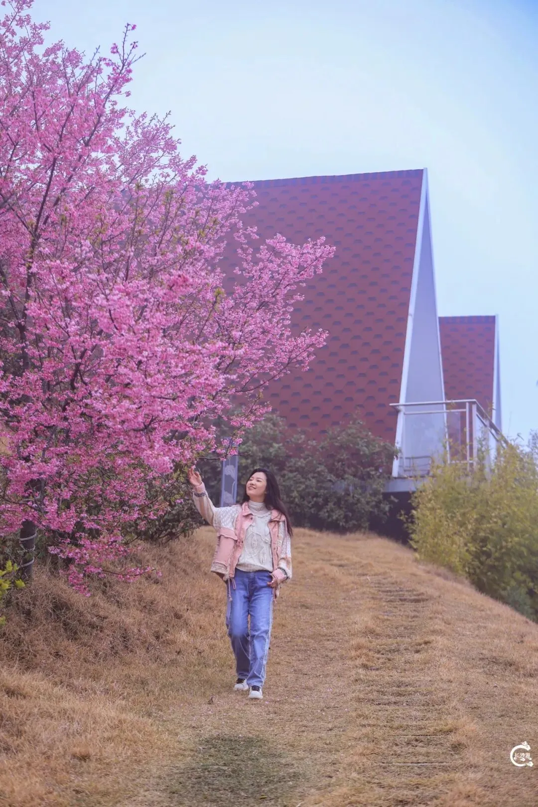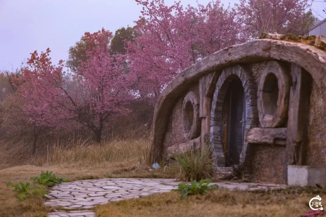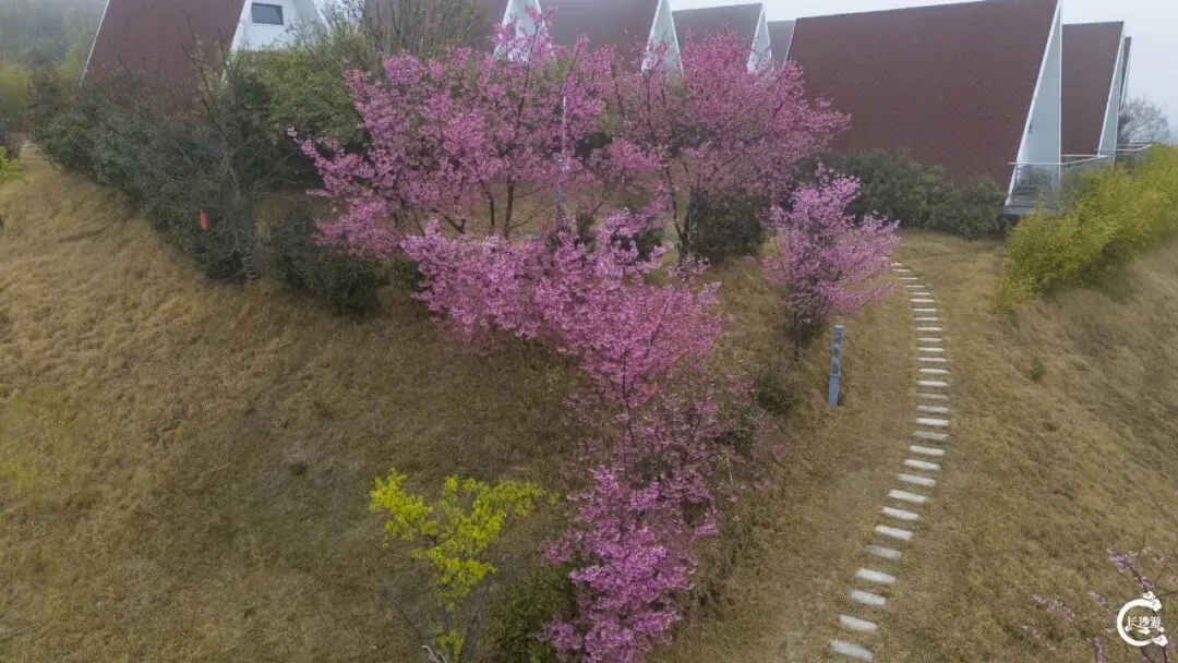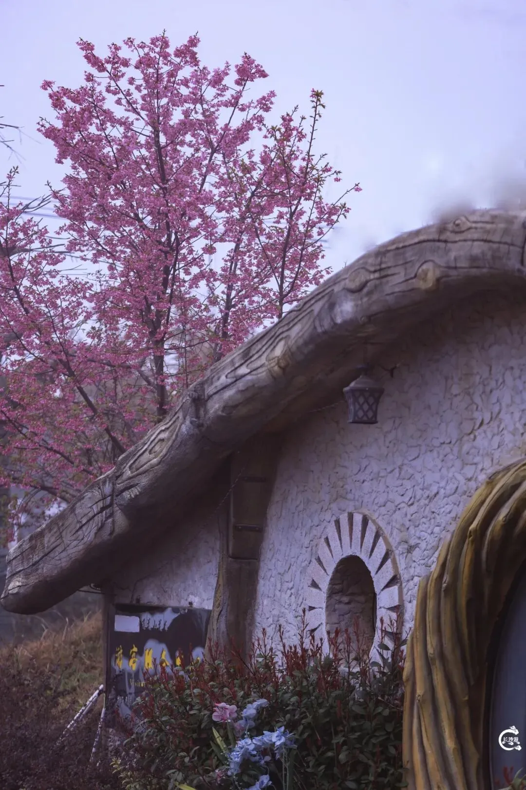 春风拂过莲花山,最先撞入眼底的,是莲花山花海野奢民宿旁的粉色樱花。这里的樱花分两批绽放,上百亩早樱已然落幕,花瓣随风飘落,枝头已冒出嫩绿的新叶,藏着春去春来的温柔。好在民宿入口处,那几棵霍比特小屋造型旁的樱花正开得盛艳,粉白花瓣缀满枝头,微风一吹,细碎的花瓣轻轻摇曳,自带浪漫滤镜,随手一拍都是治愈感满满的春日大片。
