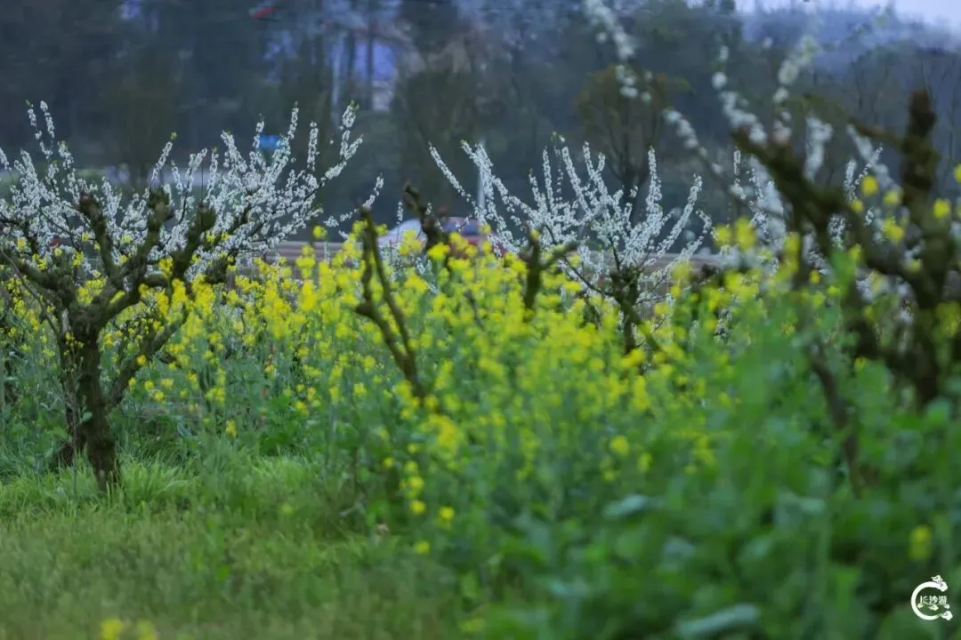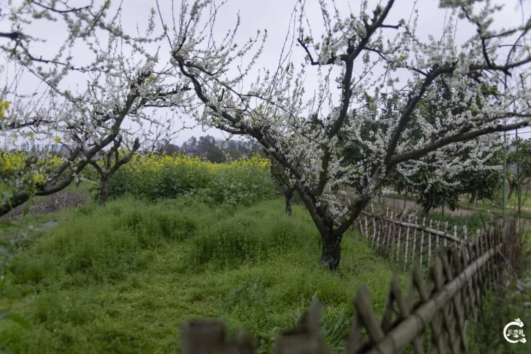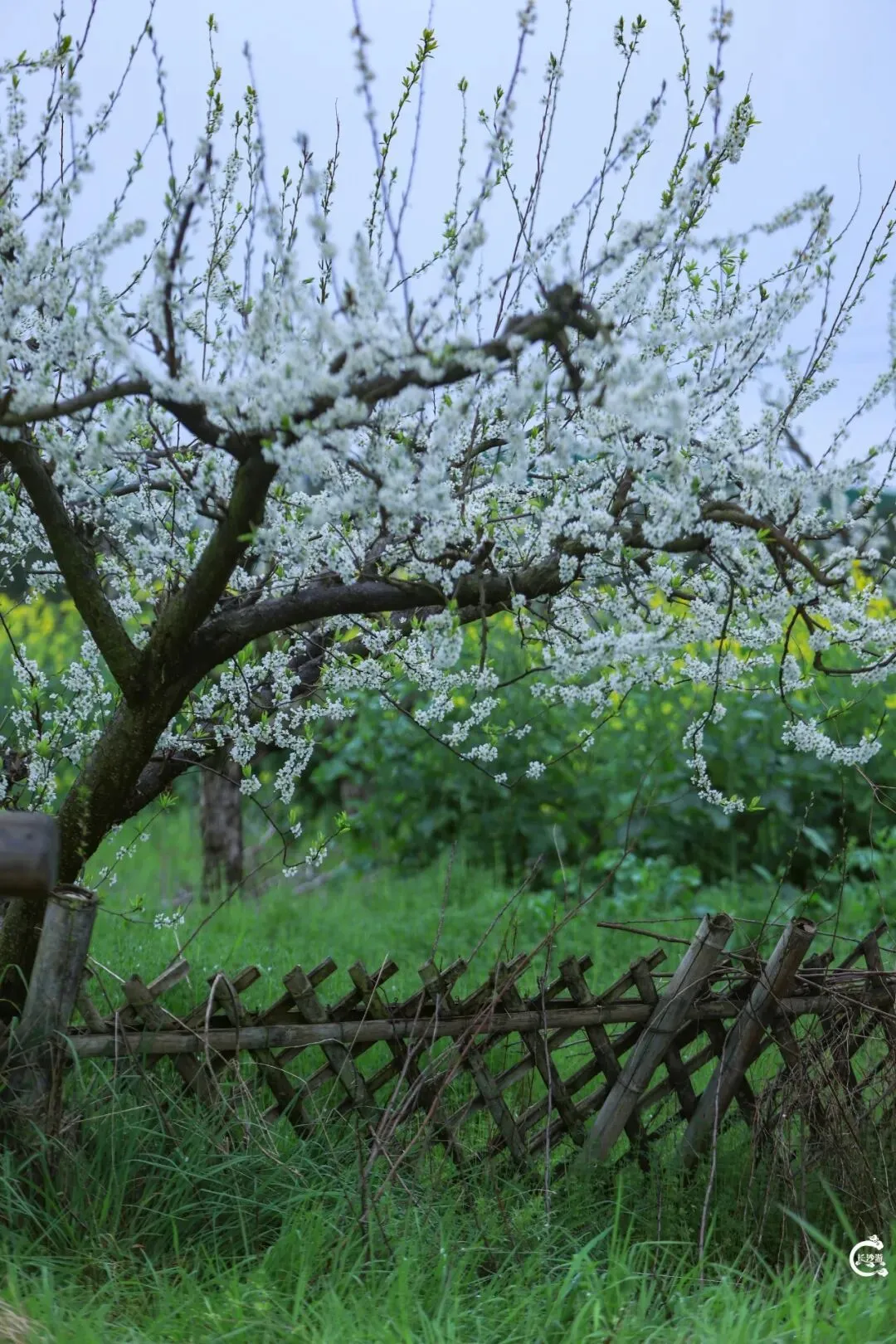 顺着莲花山往下走,望山耕读的景致更是让人驻足。这里的李花已进入最佳观赏期,盛放四五天的它,虽没有成片花海的磅礴,却有着散落各处的清雅。零零散散的李花,有的藏在金黄的油菜花间,有的依偎在篱笆旁,最出片的当属篱笆后面那两棵,枝繁叶茂、花开最盛,洁白的花瓣莹白似雪,风过处,花瓣轻飘,宛如一场温柔的雪落,藏着不与百花争艳的素雅之美。