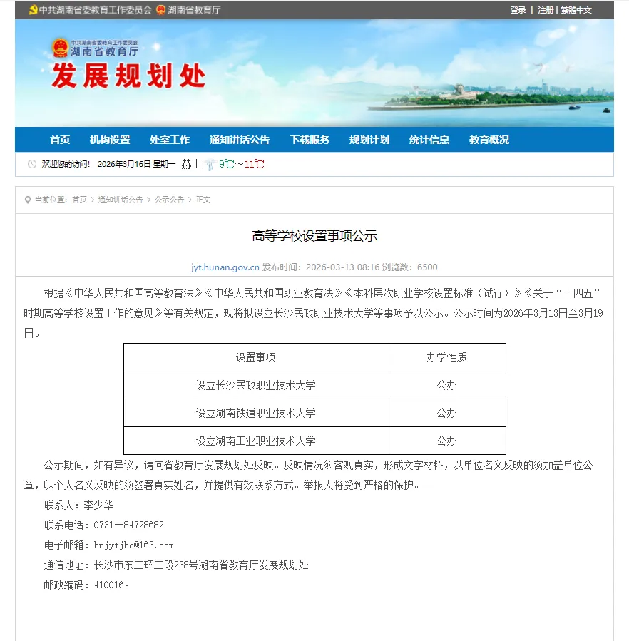 【教育厅公示】拟设立长沙民政职业技术大学、湖南铁道职业技术大学、湖南工业职业技术大学 三所职业本科大学