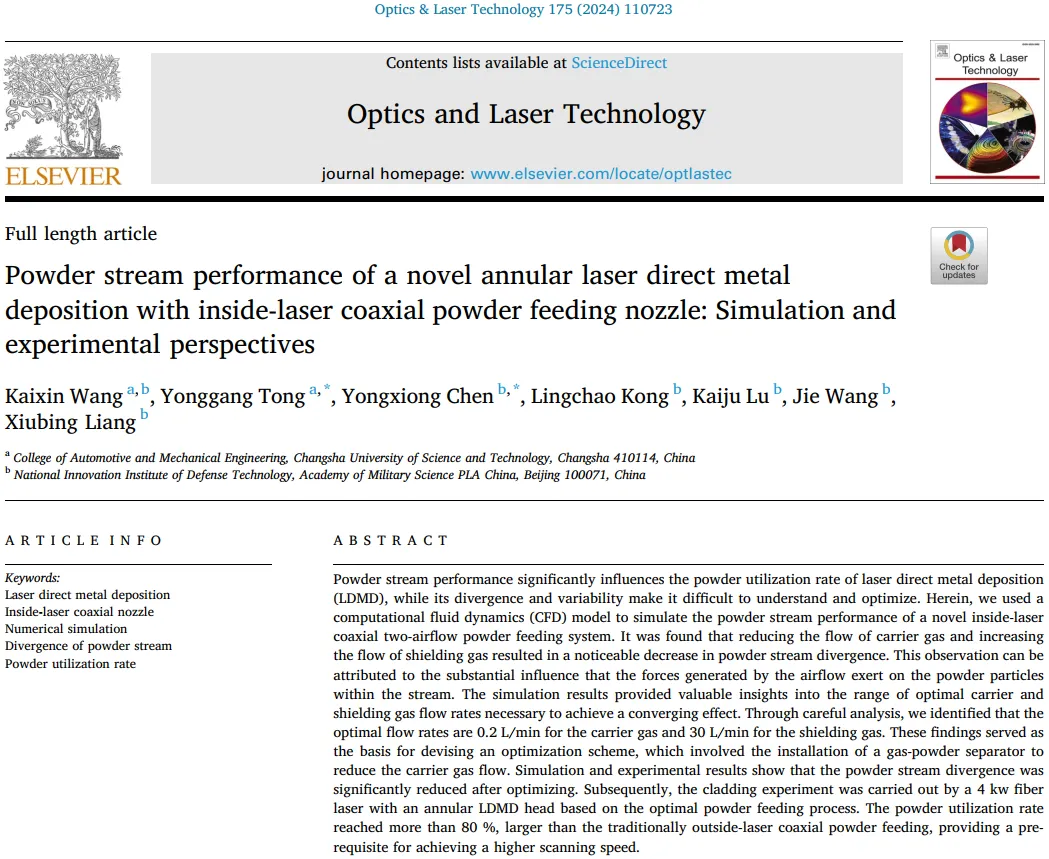 文章标题:Powder stream performance of a novel annular laser direct metal deposition with inside-laser coaxial powder feeding nozzle: Simulation and experimental perspectives