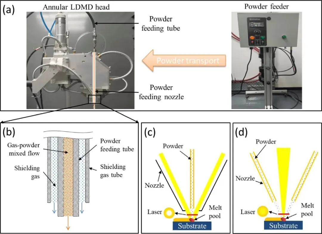 图1:详细展示了研究所用的环形激光直接金属沉积头的粉末输送系统构成。图1(b)的剖面图清晰揭示了内部同轴送粉喷嘴的核心结构,包括中心的粉末输送管和外部的环形保护气通道。图1(c)与(d)的对比,生动阐释了新型内激光同轴送粉与传统外激光同轴送粉在光粉耦合模式上的根本区别,凸显了前者粉末流穿过环形光斑中心、光粉耦合效率更高的设计优势。