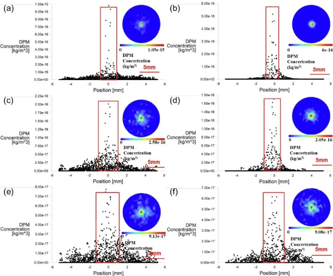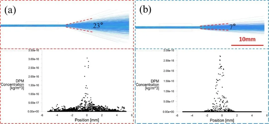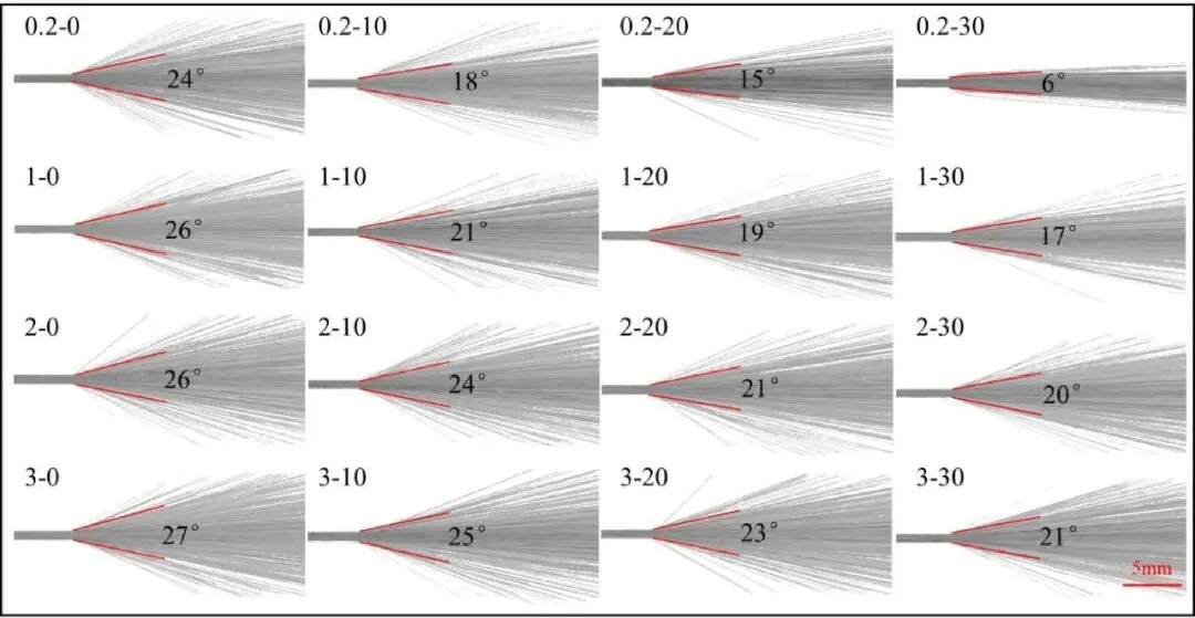 图4:通过一系列数值模拟云图,系统地展示了在不同载气(0.2至3 L/min)和保护气(0至30 L/min)流量组合下,粉末流的形态变化。图中清晰可见,随着载气流量的降低和保护气流量的升高,粉末流的发散角显著减小。当载气为0.2 L/min且保护气为30 L/min时,粉末流形态最为理想,发散角可被控制在极小的6°,直观地揭示了工艺参数对粉末束流聚焦性的决定性影响。