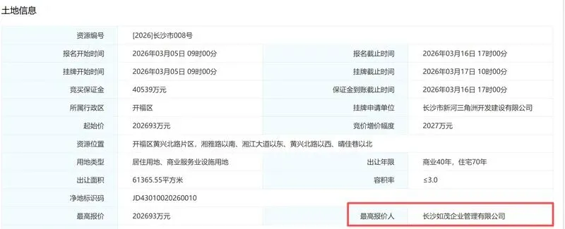 此番第三次挂牌,最终由长沙如茂企业管理有限公司以底价成功摘得。