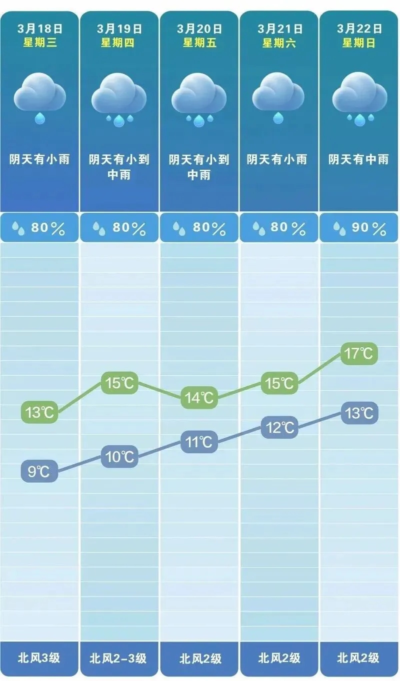 3月18日,阴天有小到中雨,北风3级,9~11℃;3月19日,阴天有小到中雨,北风2级,10~12℃。